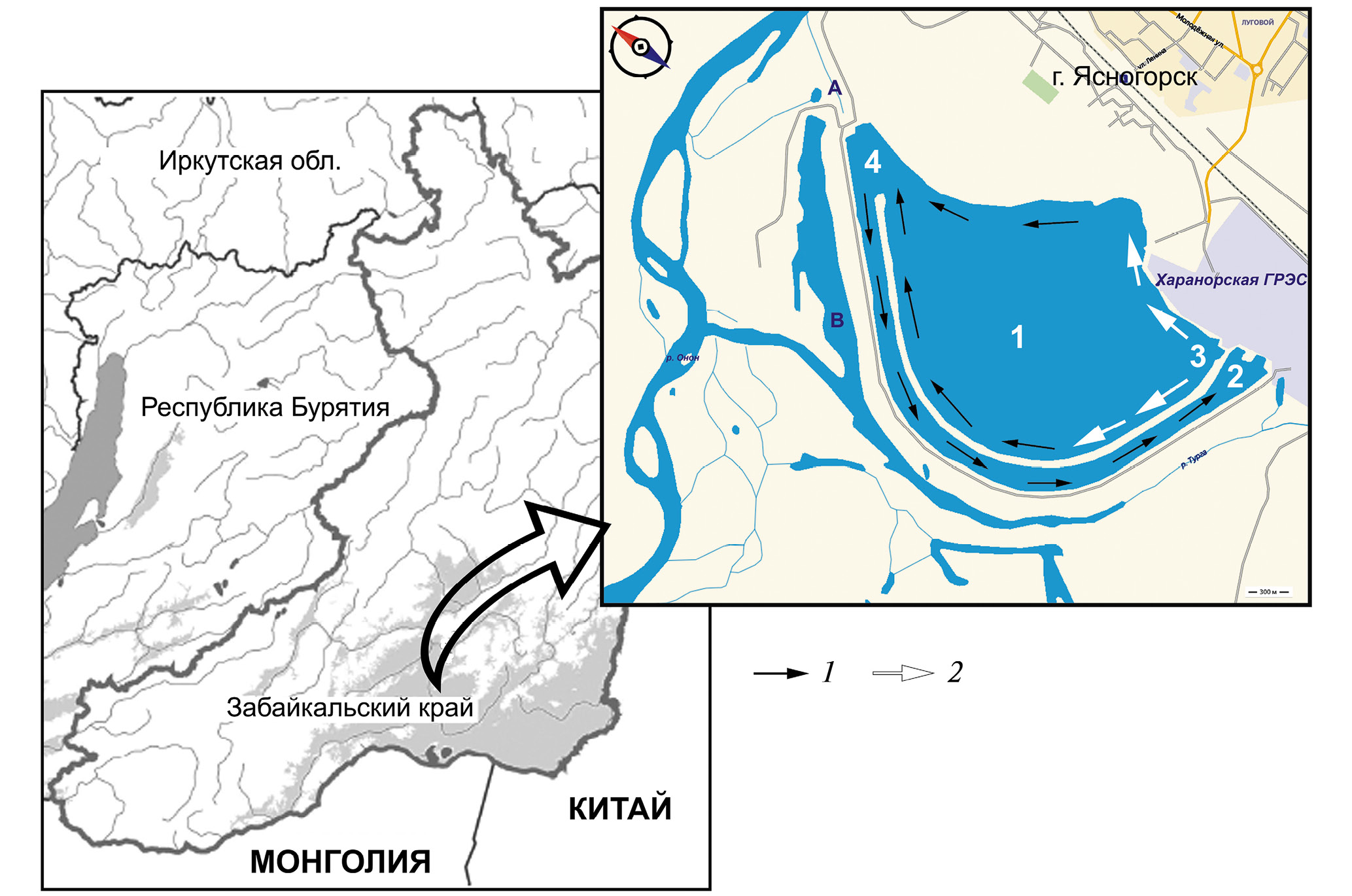 Объект исследований. Харанорская ГРЭС — тепловая электростанция в Забайкальской энергосистеме мощностью 665 МВт. Станция вырабатывает >2.7 млрд кВт × ч/год электроэнергии. Фактическая тепловая мощность достигает ~134 тыс. Гкал. Водохранилище-охладитель ХГРЭС (50°51′12″ с.ш.; 115°40′41″ в.д.) представляет собой наливной водоем прудового типа, образованный путем обвалования дамбами участка поймы р. Онон в месте впадения в нее р. Турга. Площадь водного зеркала при нормальном подпорном уровне (НПУ, 574 м Балтийской Системы (БС)) 4.1 км2, объем водной массы 15.6 млн м3, периметр 8.6 км, средняя глубина 3.8 м. Заполнение и подпитка водоема в период открытой воды происходит за счет подачи воды из р. Онон по водоподводящему каналу, в период ледостава — из дренажного канала. Вода из пруда на станцию поступает через водозаборный канал и сбрасывается в водосбросный канал. Система технического водоснабжения станции смешанная (прямоточно-оборотная летом и полностью оборотная зимой) (рис. 1).