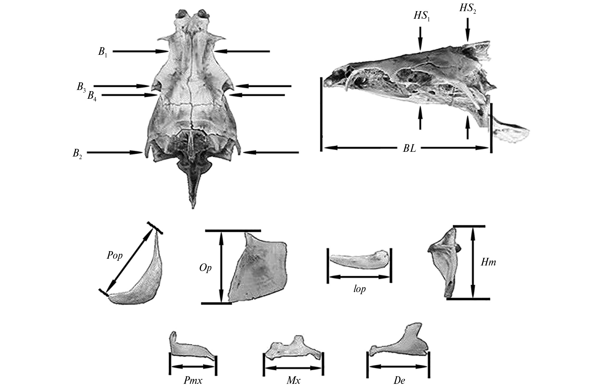 Рис. 1. Схема промеров черепа алтайских османов рода Oreoleuciscus и африканских усачей комплекса Barbus intermedius. Параметры осевого черепа: BL − базальная длина черепа; B1, B2, B3 – расстояние между внешними краями соответственно frontalia, pterotica и sphenotica; B4 – ширина черепа на уровне соединения frontale и pteroticum, HS1 и HS2 – высота черепа на уровне соответственно изгиба parasphenoideum и заднего края parasphenoideum. Параметры висцерального черепа: Hm — высота hyomandibulare, Pop − длина praeoperculum, Op — высота передней части operculum, Iop — длина interoperculum, Pmx, Mx и De — длина praemaxillare, maxillare и dentale соответственно.