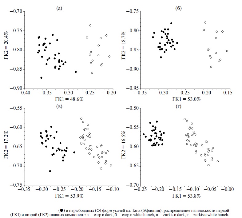 Существенно иная структура различий наблюдается между рыбоядной и нерыбоядной формами алтайских османов вида Oreoleuciscus humilis в оз. Орог (рис. 4е), где нагрузки шести параметров нейрокраниума разделились на две равные по численности группы. Нагрузки трех параметров со знаком “+” находятся в первой координатной плоскости, нагрузки трех других со знаком “–” расположены в четвертой координатной плоскости. Этим структура морфологических различий двух экологических форм алтайских османов оз. Орог существенно отличается от таковой в оз. Баян (рис. 4е), а также от структуры различий форм османов и усачей на рис. 4а–4д, где шесть параметров нейрокраниума образуют единую группу, расположенную в первой координатной плоскости. Таким образом, структура различий между рыбоядными и нерыбоядными формами алтайских османов вида O. potanini в двух озерах запада Центрально-Азиатского бессточного бассейна почти совпадает со структурой различий между рыбоядными и нерыбоядными формами усачей комплекса Bаrbus intermedius в африканском оз. Тана. Вместе с тем структура различий рыбоядной и нерыбоядной форм алтайских османов Oreoleuciscus humilis в озере, расположенном на востоке Центрально-Азиатского бессточного бассейна, существенно отличается от структуры различий экологических форм вида Oreoleuciscus potanini и усачей комплекса Barbus intermedius.