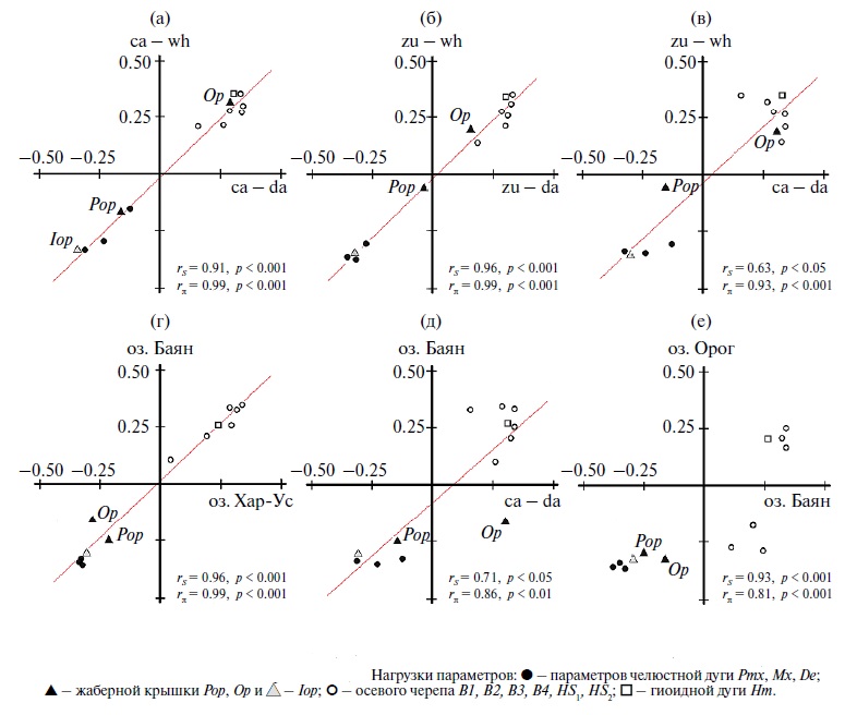 При сравнении пары carp‒white hunch (cа–wh) с парой carp‒dark (са–da) тренд распределения факторных нагрузок описывается прямой, величины нагрузок по обеим осям весьма близки (рис. 4a). Символы, соответствующие параметрам, располагаются вдоль линии регрессии, угол наклона которой от 45° визуально неотличим. Группы параметров с положительными (“+”) и отрицательными (“–”) нагрузками на сравниваемые векторы полностью совпадают. В первую группу (“+”) входят все шесть параметров нейрокраниума (B1, B2, B3, B4, HS1, HS2), параметр гиоидной дуги (Hm) и один из трех параметров жаберной крышки (Op), во вторую группу (“–”) — три параметра челюстной дуги и два параметра жаберной крышки (Iop и Pop). Почти идентичное распределение факторных нагрузок имеет место на рис. 4б, где СВ1 пары zurkis‒white hunch (zu–wh) сравнивается с СВ1 пары zu‒dark (zu-da), и на рис. 4в при сравнении пар zurkis‒white hunch (zu‒wh) и carp-dark (ca-da). Близкий к 1 коэффициент корреляции не оставляет сомнений в том, что на рис. 4a–4в между собой сравниваются векторы, отражающие не разные, хотя и сходные между собой процессы, но разные конкретные реализации одного и того же процесса, а именно — процесса морфологической дивергенции рыбоядных и нерыбоядных морфотипов. Это же справедливо и в отношении СВ1 рыбоядных и нерыбоядных экологических форм османов озер Баян и Хар-Ус (рис. 4г). Тесное распределение факторных нагрузок вдоль линии регрессии и близкий к единице коэффициент корреляции позволяют считать, что и здесь между собой сопоставляются разные реализации одного типового процесса в разных совокупностях особей. Единственное отличие от распределений на рис. 4а–4в заключается в том, что если в СВ1 африканских усачей нагрузки Op и Pop имеют разные знаки (“+” и “–” соответственно), то в СВ1 алтайских османов обе нагрузки имеют знак “–” и находятся в третьей координатной плоскости. Указанное различие СВ1 усачей и османов хорошо видно на рис. 4д.