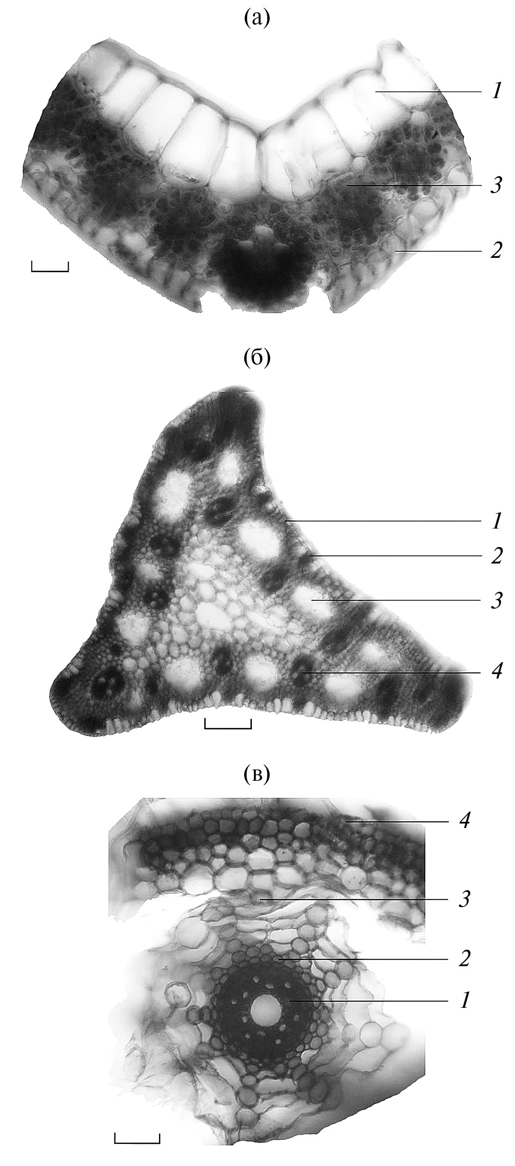 Рис. 2. Микрофотографии Dichostylis micheliana: а — лист (1 – верхняя эпидерма, 2 – нижняя эпидерма, 3 – обкладочные клетки); б — стебель (1 – эпидерма, 2 – устьице, 3 – аэренхима, 4 – проводящий пучок); в — корень (1 – сосуды ксилемы, 2 – эндодерма, 3 – паренхима первичной коры, 4 – эпиблема). Масштабная линейка: 4.7 мкм.