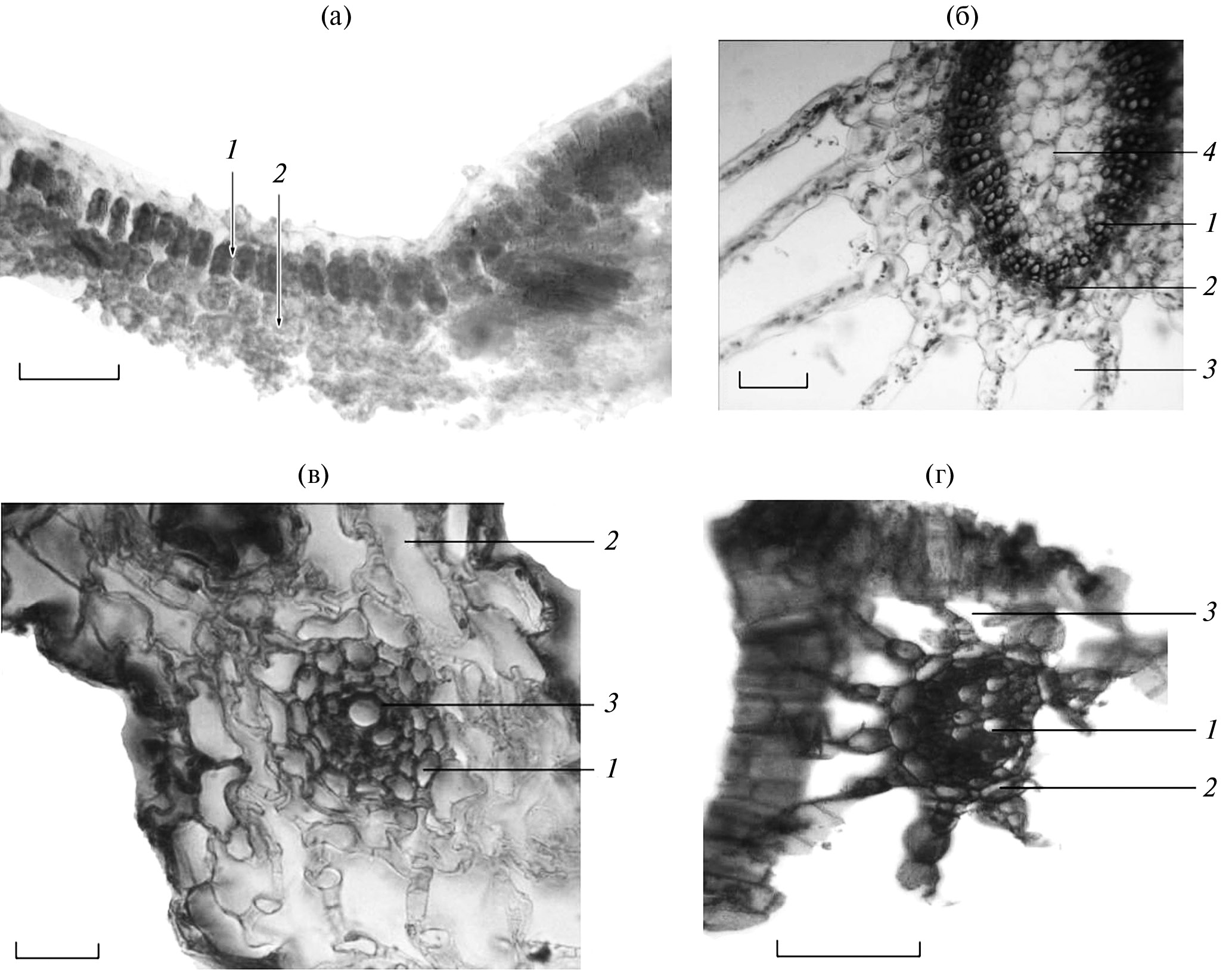 Рис. 3. Микрофотографии видов Lindernia procumbens (а), Gratiola japonica (б), Limosella aquatica (в), Lindernia procumbens (г): а — лист (1 – столбчатый мезофилл, 2 – губчатый мезофилл; б — стебель (1 – сосуды ксилемы, 2 – эндодерма, 3 – аэренхима, 4 – основная паренхима); в — корень (1 – эндодерма, 2 – аэренхима, 3 – стела); г — корень (1 – сосуды ксилемы, 2 – эндодерма, 3 – аэренхима). Масштабная линейка: а, г — 12 мкм; б, в — 4.7 мкм.