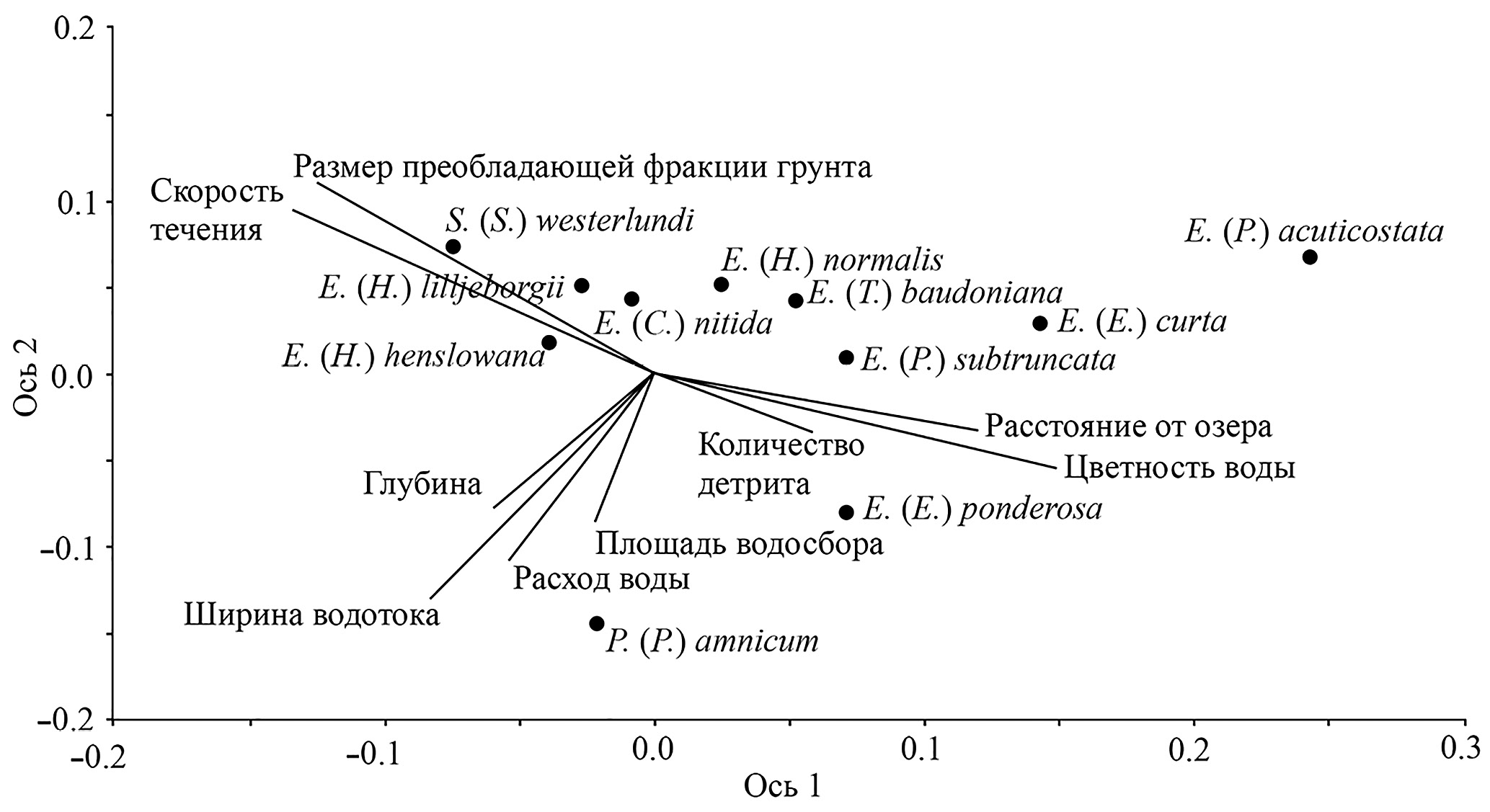 Расположение видов моллюсков сем. Sphaeriidae в пространстве осей ординации, позволяющее визуально оценить их отношение к условиям среды, представлено на рис. 1. На ординационной диаграмме в правой части (вдоль первой оси) расположились виды, приуроченные к малым лесным водотокам, в левой — “предпочитающие” крупные реки и участки ниже проточных озер.