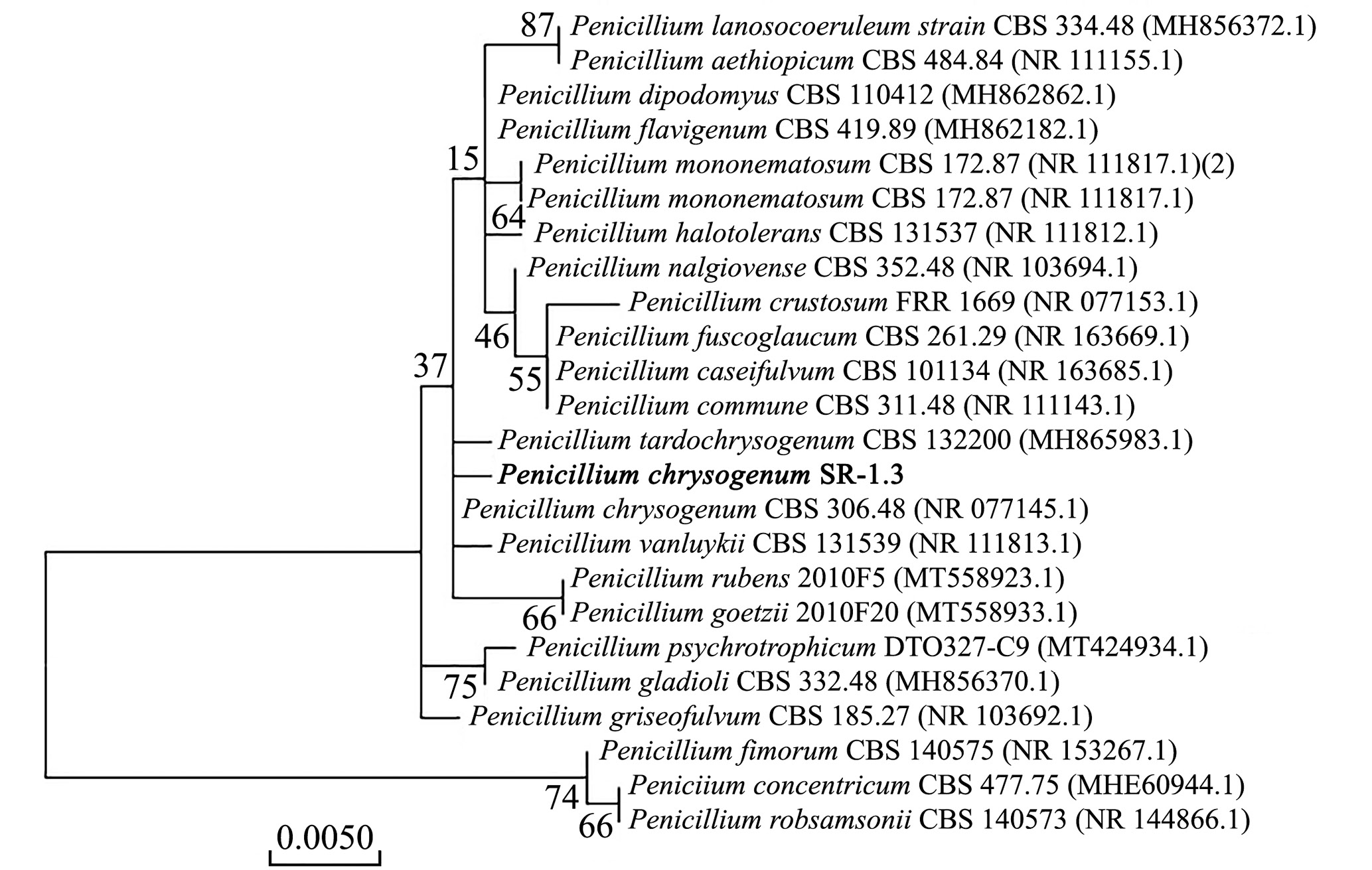 Рис. 1. Филогенетическое дерево для штамма Penicillium chrysogenum SR–1.3, построенное на основе последовательностей ITS-региона с использованием метода Maximum Likelihood.