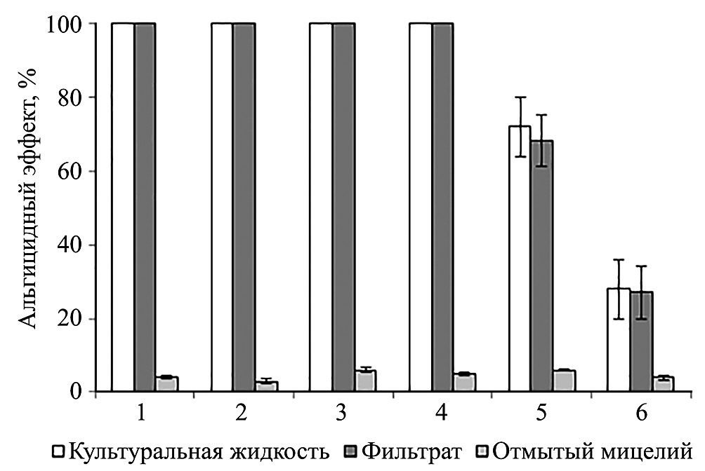 Рис. 2. Альгицидный эффект штамма SR–1.3 в отношении тест-культур после 48 ч культивирования. Здесь и на рис. 3, 1 – Microcystis aeruginosa; 2 – Planktothrix agardhii; 3 – Aphanizomenоn flos-aquae; 4 – Anabaena cylindrica; 5 – Oocystis parva; 6 – Scenedesmus quadricauda. Здесь и далее результаты представлены как M ± SD трех независимых биологических повторностей.
