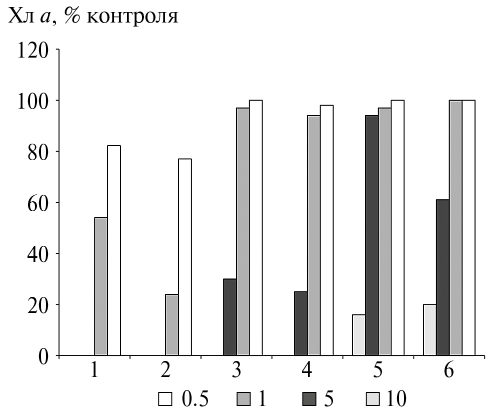 В случае с зелеными водорослями Oocystis parva и Scenedesmus quadricauda литическое действие фильтрата штамма SR–1.3 наблюдали только при его высокой концентрации — 10%. Однако в этом случае полного лизиса клеток не происходило, содержание Хл а по сравнению с контрольными вариантами было 16 и 20% соответственно. При меньшем содержании фильтрата (1 и 5%) содержание Хл а в клетках зеленых водорослей статистически достоверно не отличалось от контрольного варианта у Oocystis parva и было ниже на 40% (р <0.05) у Scenedesmus quadricauda при содержании фильтрата 5%.