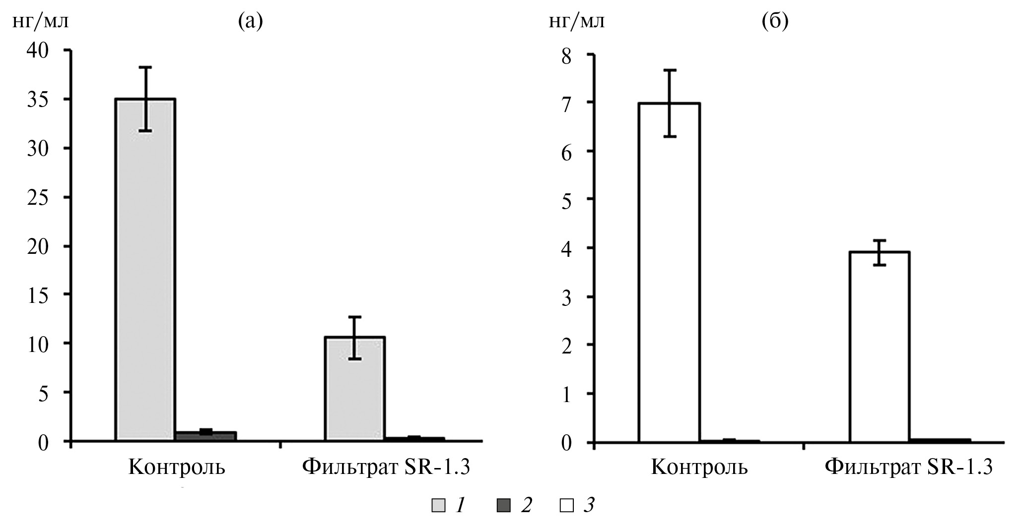 Рис. 5. Влияние фильтрата штамма SR–1.3 на содержание микроцистинов, нг/мл (ось ординат) в средах культивирования Microcystis aeruginosa 973 (а) и Planktothrix agardhii 1113 (б). 1 – MC-LR, 2 – dm-MC-LR, 3 – dm-MC-RR.