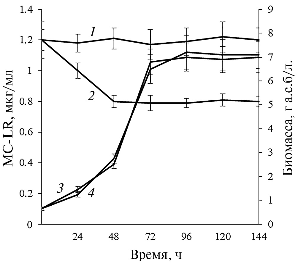 Результаты исследования процессов удаления микроцистина-LR штаммом Pеnicillum chrysogenum SR–1.3 представлены на рис. 6. Концентрация MC-LR статистически значимо не изменялась (р > 0.05) в абиотическом контроле (без клеток микромицета), что свидетельствует о биологической природе убыли микроцистина (рис. 6). В условиях роста культуры P. chrysogenum SR–1.3 отмечено снижение содержания MC-LR на 33.6% за 48 ч культивирования. При дальнейшем инкубировании концентрация токсина статистически значимо не изменялась. Следует отметить, что в исследуемой концентрации 1.2 мкг/мл микроцистин-LR не оказывал влияния на рост микромицета SR–1.3 (рис. 6, линии 3 и 4).