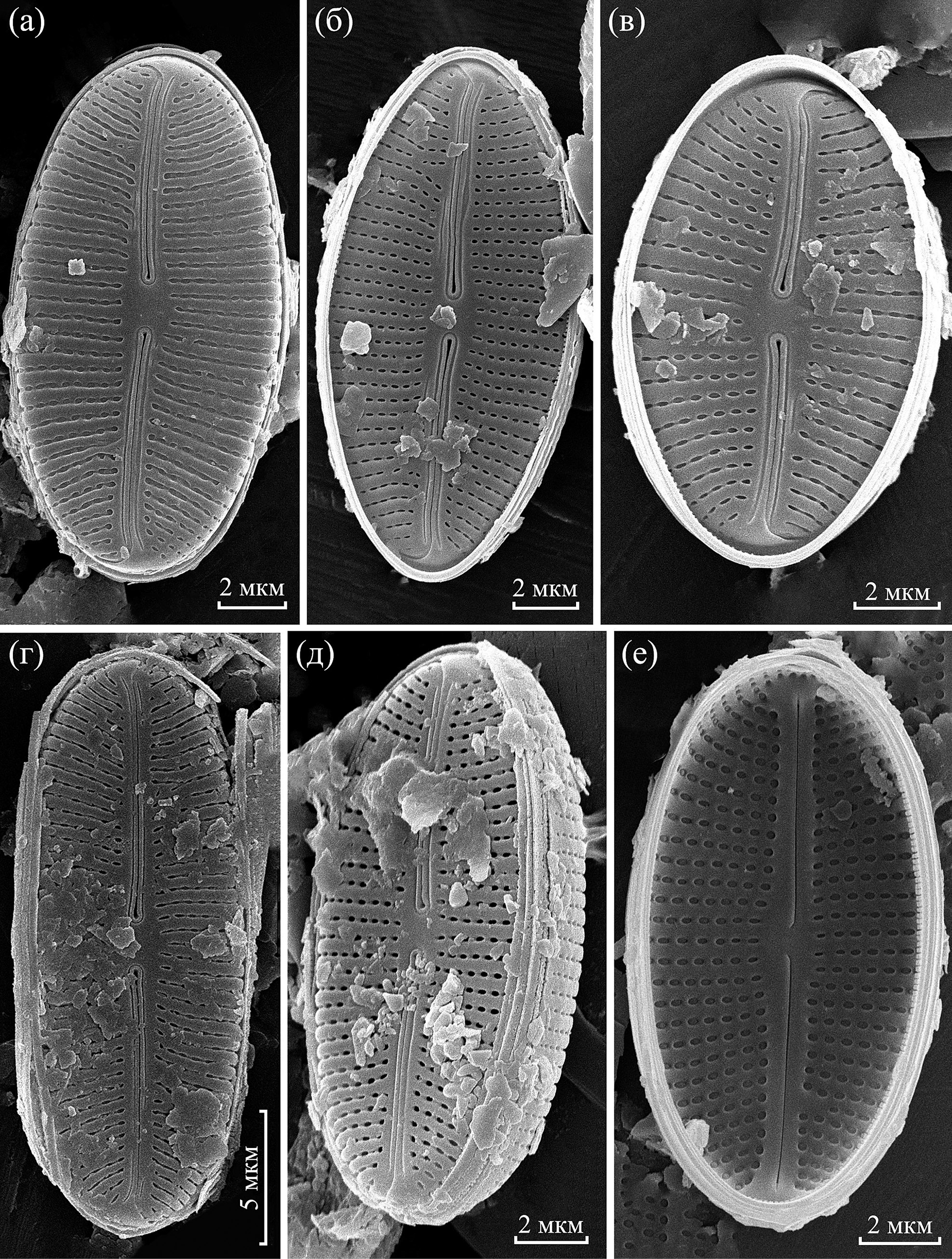 B. strelnikovae встречается и в других сходных по экологии озерах этого региона (Якутия) (рис. 1, табл. 1, 2) и это первая находка представителя рода за пределами оз. Байкал. Для данного региона имеется недостаточно работ по изучению Bacillariophyta с применением электронной микроскопии. В единственной публикации по небольшим водоемам полигонально-валиковой тундры о. Тит-Ары (нижнее течение р. Лены) в фитоперифитоне обнаружено 160 таксонов диатомовых водорослей, в том числе 13 водорослей определенных только до рода (Amphora, Cavinula, Discostella, Encyonema, Eunotia, Fragilaria, Gomphonema, Pinnularia, Stephanodiscus) (Копырина и др., 2021), что свидетельствует о потенциальном богатстве флоры этой группы и необходимости дальнейших альгологических исследований.