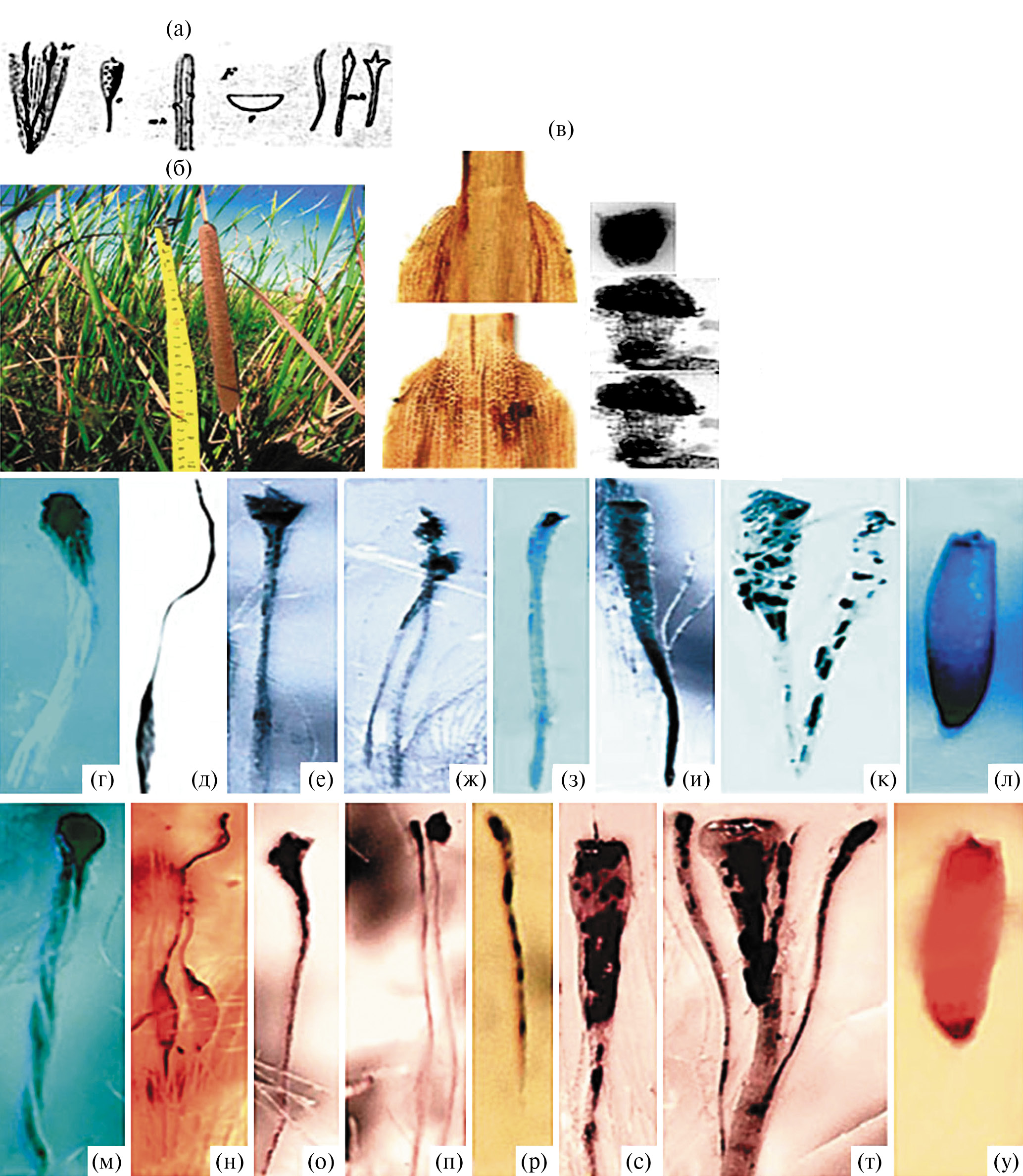 Рис. 1. Микрофотографии цветков и семян Typha angustata: a — рисунок структуры цветка из работы (Kronfeld, 1889); б — Typha angustata в прибрежьях о-ва Донского, дельты р. Дон; в — фрагменты стеблевых листьев с внешней и внутренней стороны с бородавковидными железками; г–л — микрофотографии цветков и семян из дельты р. Дон, Ростовская обл.; м–у — микрофотографии цветков и семян из Молдавии, ж/д ст. Быковец, болото, Т.С. Гейдеман, 29.06.1948, № 77635.