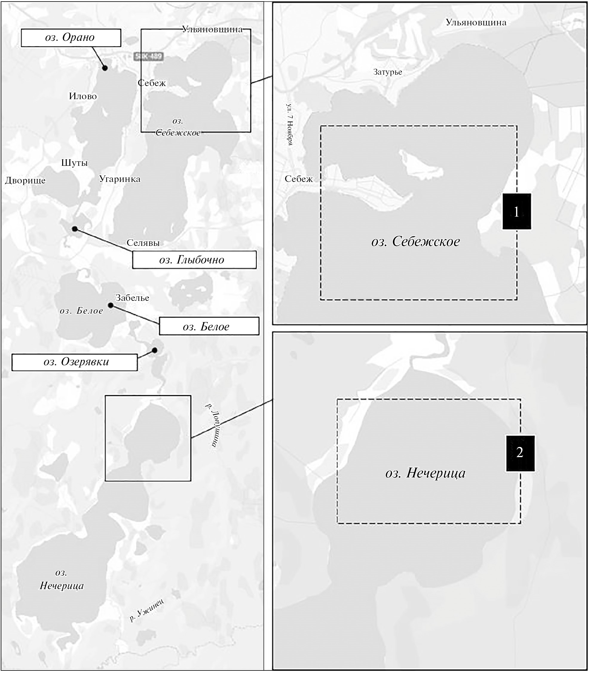 Рис. 1. Карта-схема района исследования (Псковская обл., Себежский р-н). 1 – район взятия выборки леща в оз. Себежское, 2 – в оз. Нечерица.