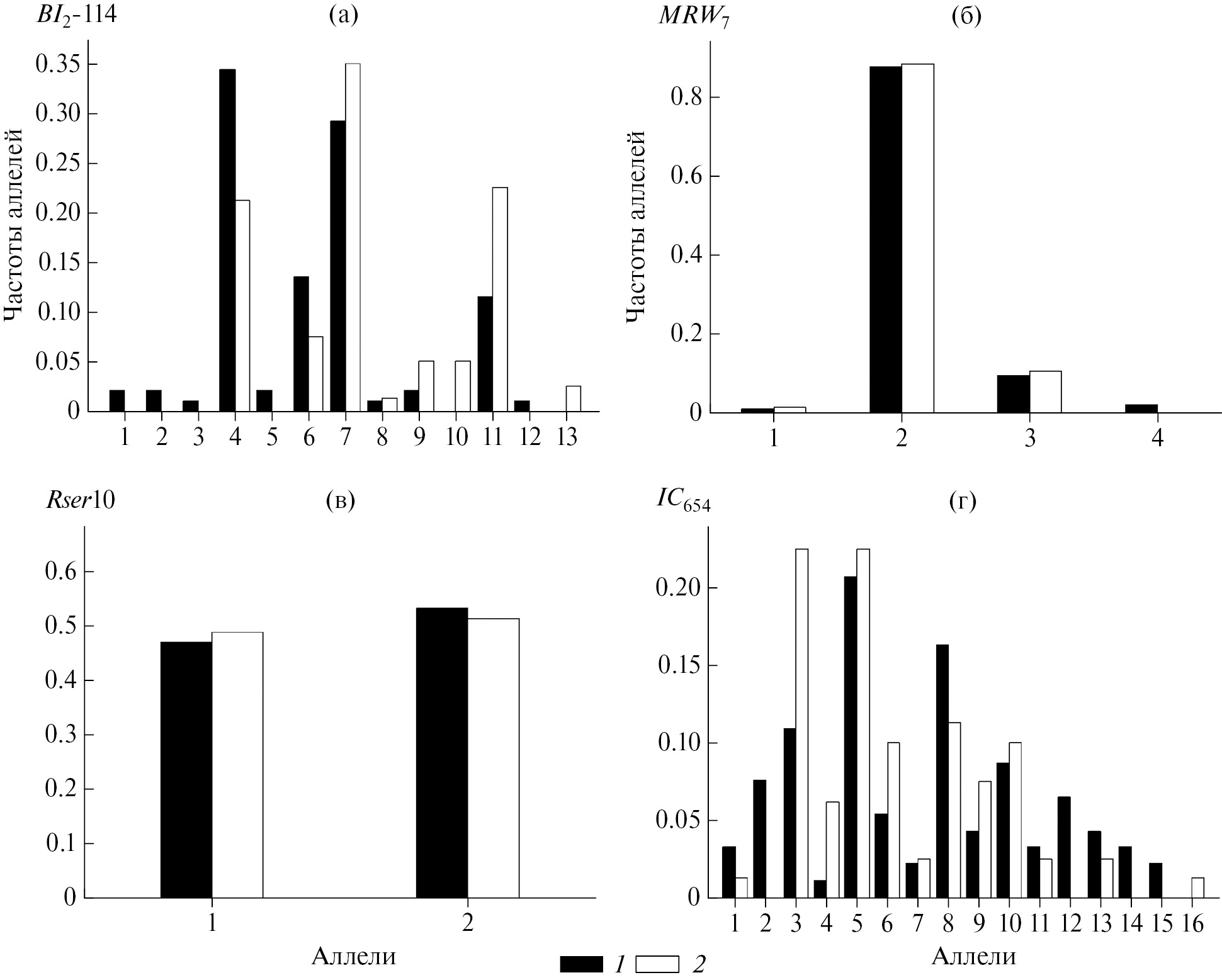 Все исследованные микросателлитные локусы были полиморфны, за исключением локуса Bl1-153, число аллелей в остальных локусах варьировало от двух (Rser10) до 15 (IС654), всего обнаружено 36 различных аллелей. Распределение частот аллелей полиморфных локусов в выборках представлено на рис. 2. Наибольшую изменчивость в выборках наблюдали по локусам IС654 (А = 16, HE = 0.887) и Bl2-114 (A = 13, HE = 0.781). Возможных ошибок генотипирования и нуль-аллелей не обнаружено. Тесты на соответствие наблюдаемых генотипических распределений теоретическому распределению Харди–Вайнберга достоверно значимых отклонений после применения коррекции Бонферрони не выявили. Основные характеристики генетической изменчивости в выборках леща представлены в табл. 1.