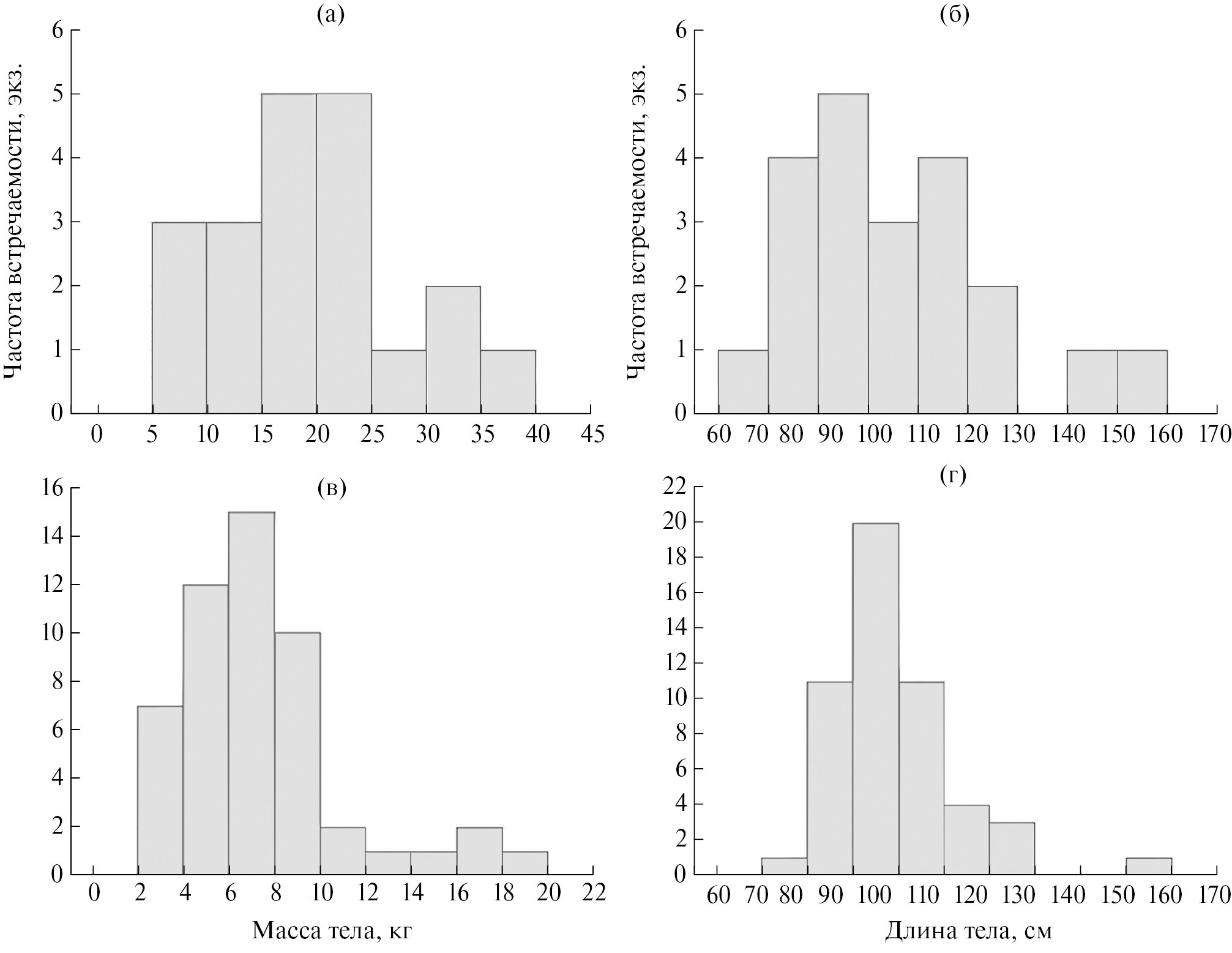 Масса, кг | 8.10 ± 1.10 3.0–14.0 | 5.00 ± 0.34 3.0–10.0 | 20.4 ± 1.97 7.0–35.0 | 7.7 ± 0.52 2.7–20.0 |