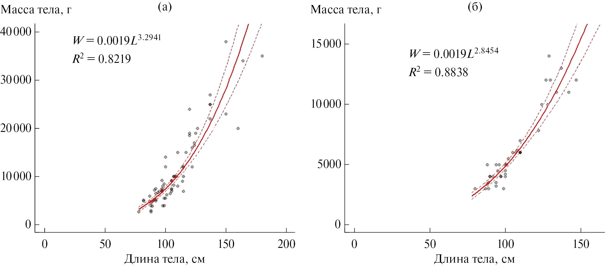 Среди различных взаимоотношений биометрических параметров у рыб исследователи наиболее часто используют соотношение длины и массы тела как функциональный инструмент, применяемый в различных исследованиях: рыбохозяйственных, экологии, популяционной динамики и оценке запасов (Pauly, 1993; Erzini, 1994; King, 1995; Petrakis and Stergiou, 1995; Ferreira et al., 2008). Это соотношение считается важным параметром в ихтиологических исследованиях, поскольку может дать информацию о состоянии популяций, коэффициентах упитанности, темпе роста, морфологических различиях, половой зрелости и репродуктивном потенциале, различных аспектах динамики популяций рыб и их общем благополучии (Le Cren, 1951; Bagenal and Tesch, 1978; Martin-Smith, 1996; Froese, 1998, 2006; Gonçalves, et al., 1997; Sutton et al., 2000; Santos et al., 2012; Torres et al., 2012; Meerbeek and Crane, 2017; Maurya et al., 2018). Это соотношение также используют для определения массы тела рыб при определенной длине их тела (Sarkar et al., 2009; Nazir and Khan, 2017).