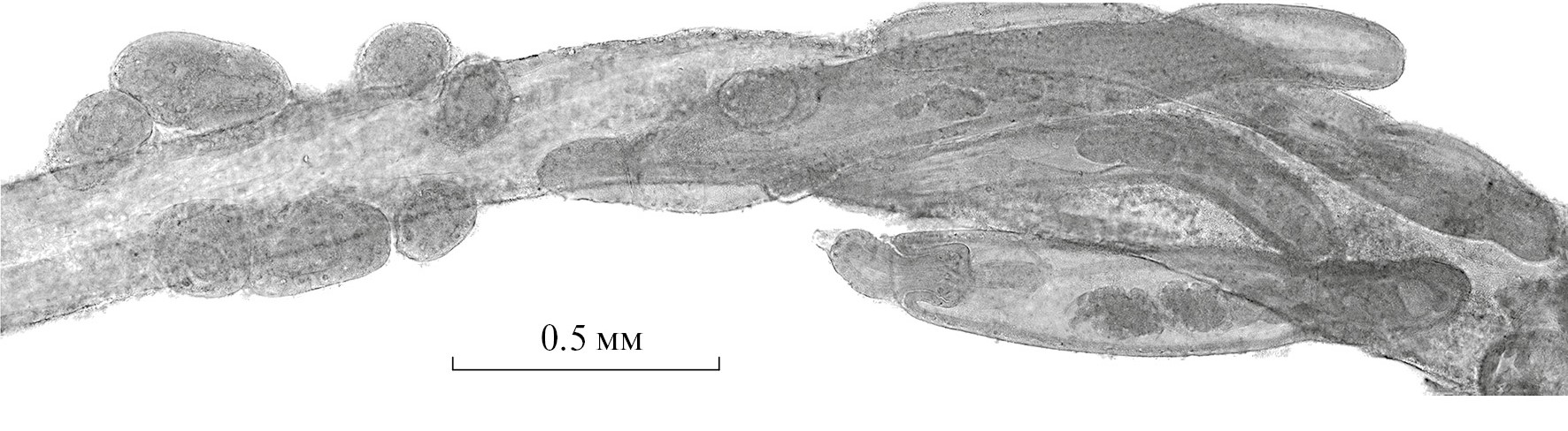 Рис. 1. Участок кишечника водяного ослика Asellus hilgendorfii с личинками Acanthocephalus tenuirostris разных стадий развития в возрасте 45 сут.