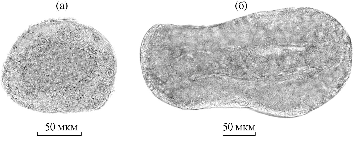 Стадия I. “Ранняя акантелла” (рис. 2а). Личинка имеет округлую форму. Во внутреннем строении отчетливо заметна более плотная область центральной ядерной массы и периферическая зона, в которой хаотично располагаются крупные ядра.
