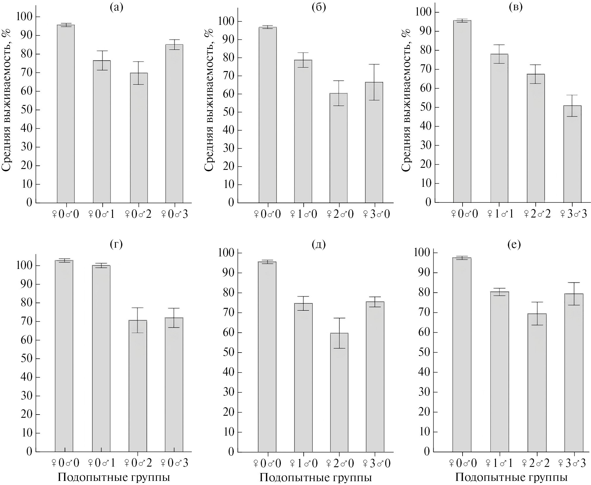 Рис. 1. Средняя выживаемость мальков F1 (а–в) и F2 (г–е) в течение 30 сут после оплодотворения.: а, г – только родители–самцы F0; б, д – только родители–самки F0; в, е – оба пола родительских особей F0. Даны среднее значение ± стандартное отклонение. Обозначения и описание подопытных групп даны в табл. 2.
