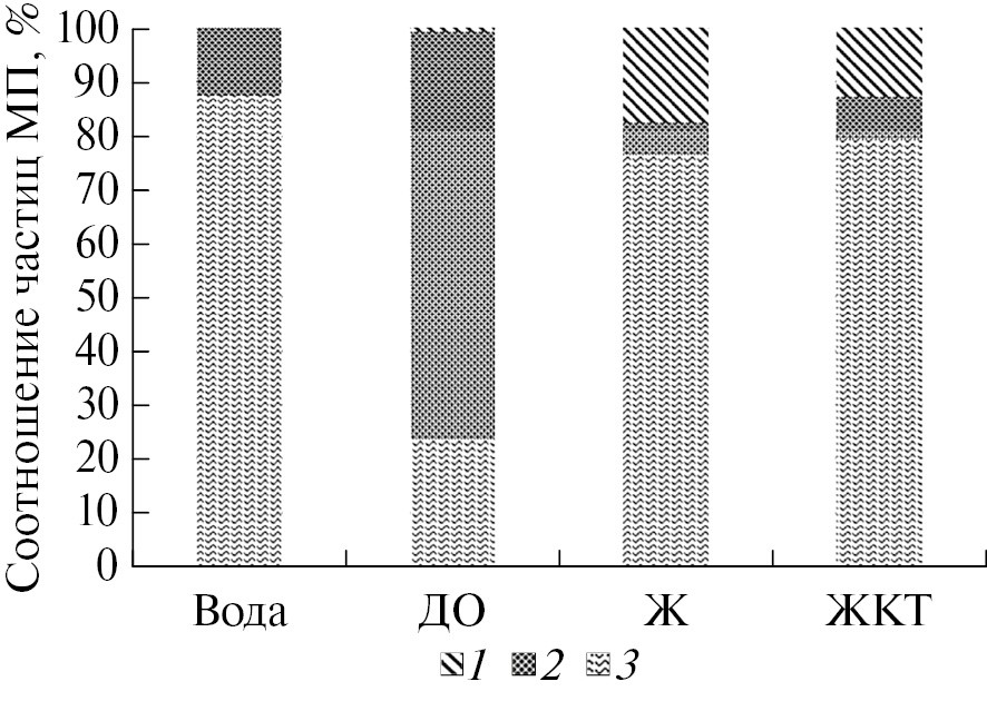 Рис. 3. Процентное соотношение различных форм частиц МП в пробах воды, ДО, Ж и ЖКТ рыб. 1 – пленка, 2 – фрагмент, 3 – нить.