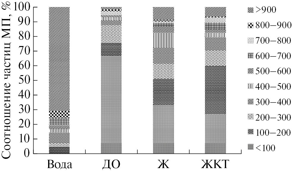 Наибольший вклад в пробах воды внесли частицы МП размером >900 мкм, в ДО бóльшая доля приходилась на частицы размером <100 мкм, в жабрах и ЖКТ рыб ≥50% МП было представлено частицами с размером <200 мкм (рис. 4).