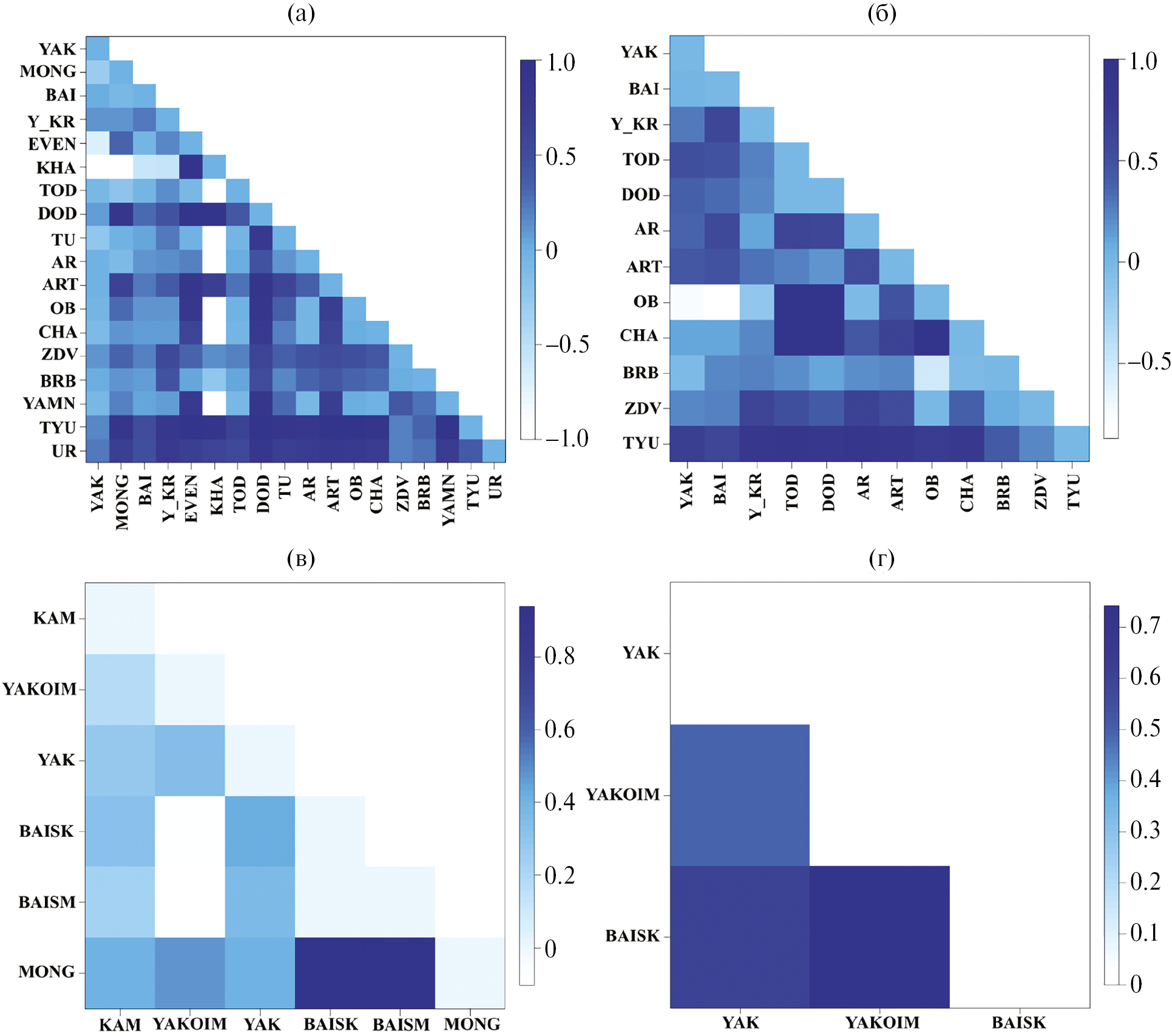 Рис. 2. Графики матриц парных FST дистанций между популяциями D. longispina s.str. (а – 12S; б – ND2) и D. dentifera (в – 12S; г – ND2). Сокращения, как на рис. 1. Дополнительно для D. longispina s.str.: EVEN – Эвенкия; KHA – Хакасия; Республика Тува (центральная часть); MONG – Монголия; YAMN – Ямало-Ненецкий автономный округ; TYU – Тюменская обл.; UR – Урал; для D. dentifera: KAM – Камчатка; YAK – Якутия, Чурапчинский улус; YAKOIM – Якутия, Оймяконский улус; BAISK – оз. Среднее Кедровое (бассейн оз. Байкал); BAISM – оз. Саган Морян (бассейн оз. Байкал).