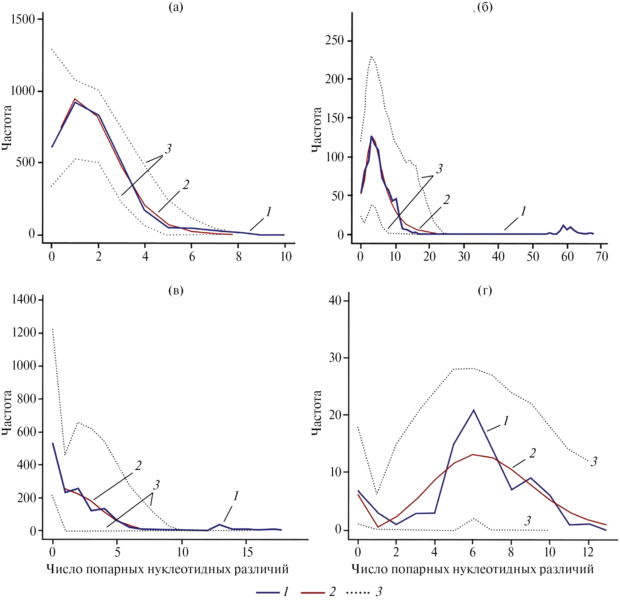 Рис. 3. Графики распределения частот гаплотипов (MMD) для модели пространственной экспансии (spatial distribution) сибирских популяций D. longispina s.str. (а, б) и D. dentifera (в, г) на основе фрагментов генов 12S (а, в) и ND2 (б, г) митохондриальной ДНК. 1 – наблюдаемое распределение; 2 – ожидаемое распределение; 3 – доверительный интервал 95%.