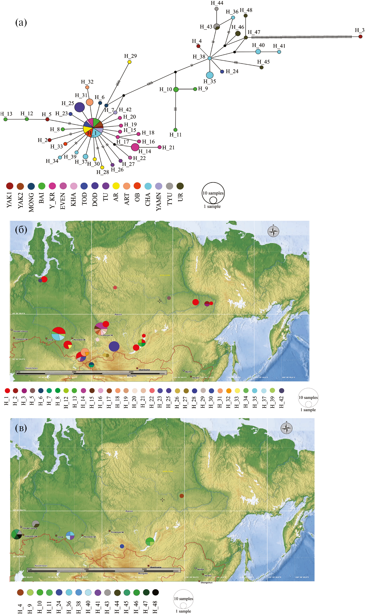 Географическое распределение и сети гаплотипов D. longispina s.str. Все гаплотипы по локусу 12S для D. longispina s.str. группируются в две крупные митохондриальные клады: “сибирскую” “А” и “европейскую” “Б”. Клады связаны через семь мутаций и два гипотетических гаплотипа (рис. 4а). К последним наиболее близки гаплотипы H_7 (горные озера Республики Алтай), H_42 (Ямало-Ненецкий автономный округ) клады “A” и H_38 (бассейн оз. Чаны) клады “Б”. Между кладами расположены гаплотипы из оз. Око Земли (бассейн оз. Байкал), формирующие специфическую митохондриальную группу гаплотипов. Отметим, что 12S гаплотипы “сибирской” клады D. longispina s.str. преимущественно встречаются в водоемах, расположенных восточнее оз. Чаны (бассейн р. Оби) и формируют звездообразную структуру с центральным гаплотипом H_1 (рис. 4a). Этот гаплотип встречается в большинстве популяций, обитающих на территории Северной Евразии – от Ямало-Ненецкого автономного округа до Якутии, однако не зарегистрирован в популяциях из Монголии, Тувы, озер Телецкоe и Додот (рис. 4б). Высокое число уникальных 12S гаплотипов D. longispina s.str. выявлено в бессточных водоемах центральной части Красноярского края (рис. 4б, H_14-H_21). Уникальные гаплотипы обнаружены почти во всех популяциях и связаны с центральным гаплотипом через одну–две, или через три–четыре мутации.