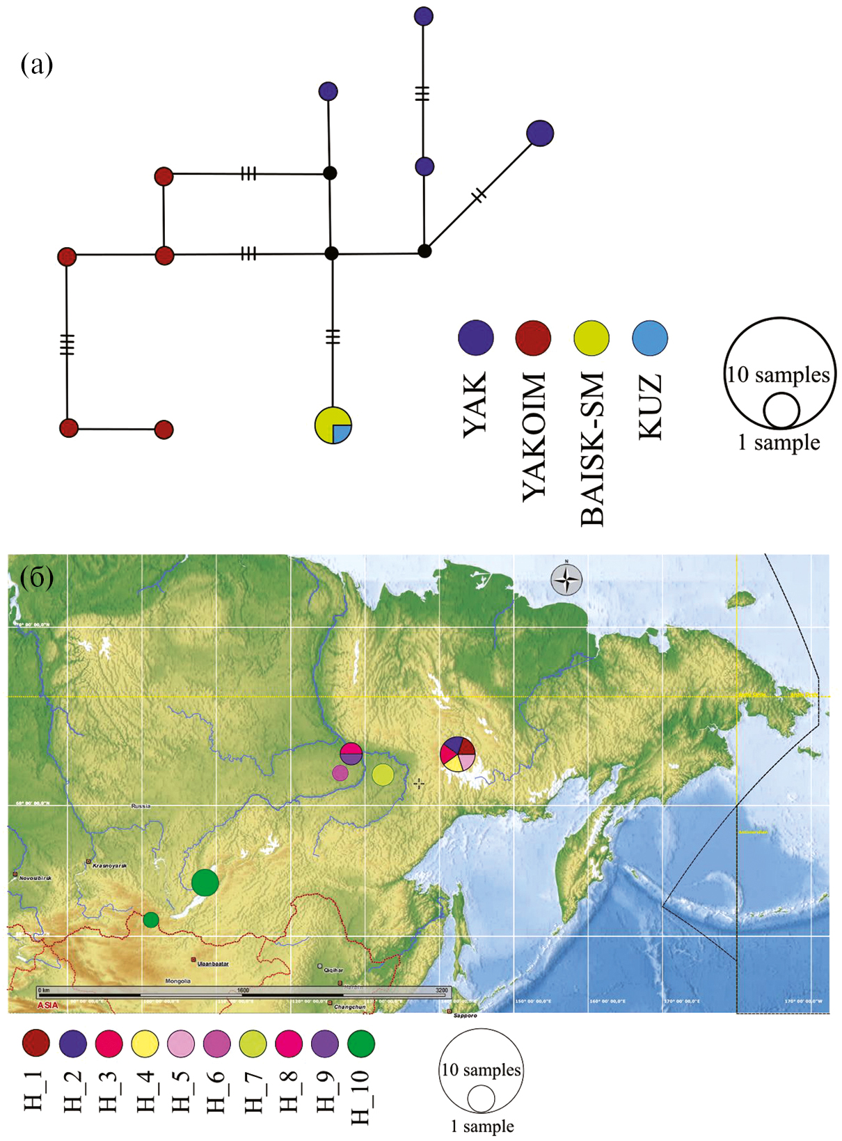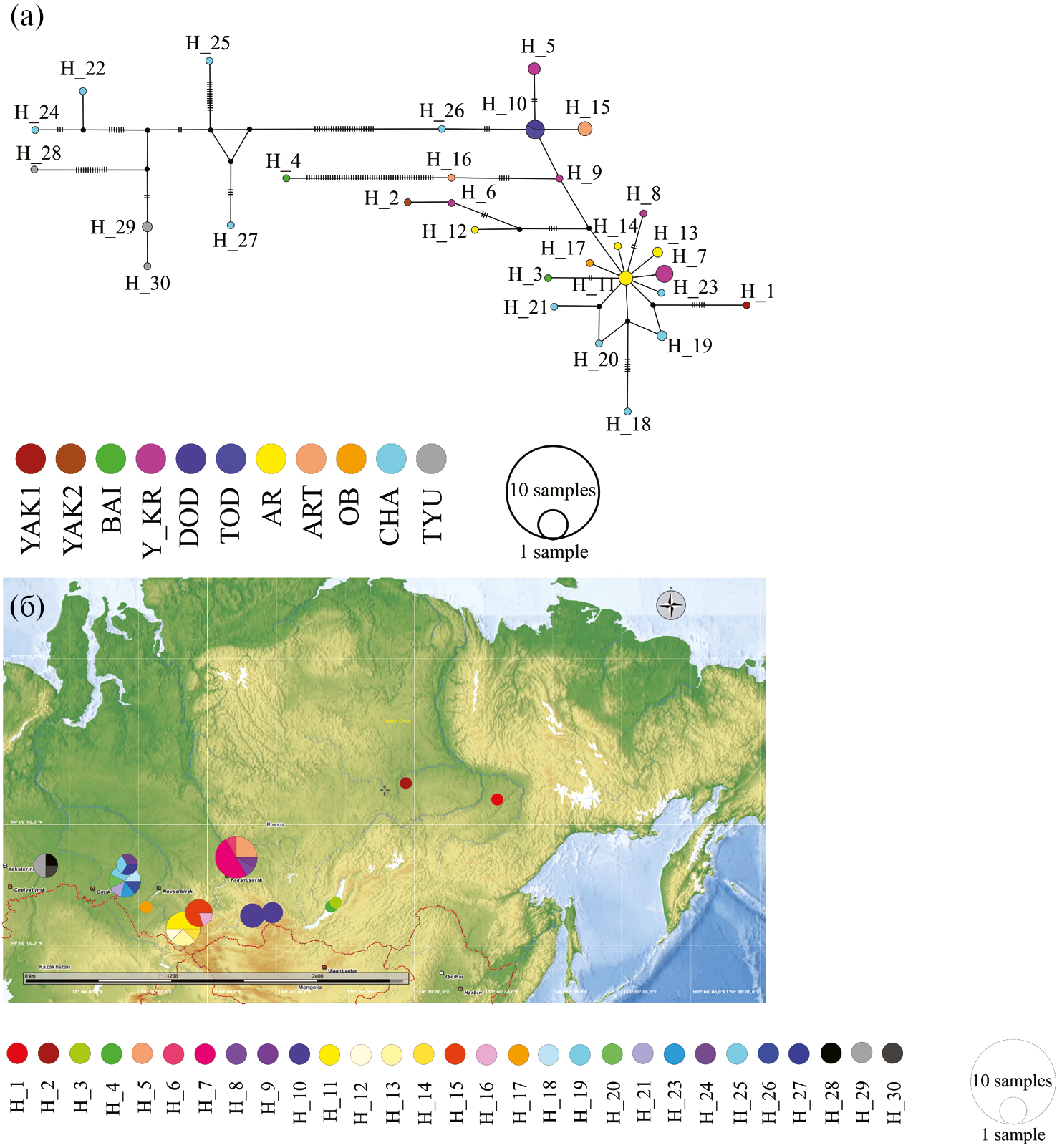 Рис. 5. Медианная сеть (MJ) ND2 гаплотипов D. longispina s.str. (a) и их географическое распространение (б). Сокращения, как на рис. 2 и рис. 4.