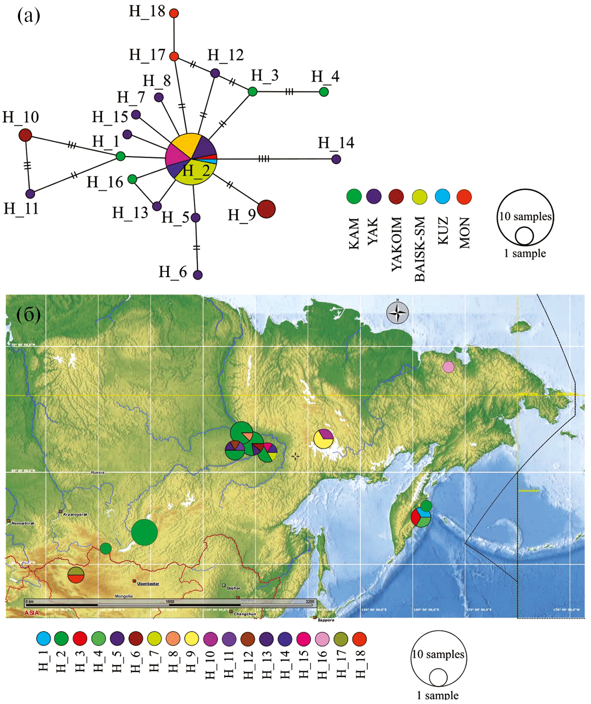 Примечание. 1 – Якутия; 2 – Монголия; 3 – бассейн оз. Байкал; 4 – Красноярский край; 5 – Хакасия; 6 – Эвенкия; 7 – Тоджинская котловина; 8 – оз. Додот; 9 – Республика Тува; 10 – Республика Алтай; 11 – Телецкое озеро; 12 – Алтайский край; 13 – оз. Чаны; 14 – с. Здвинск (Новосибирская обл.); 15 – г. Барабинск (Новосибирская обл.); 16 – Ямало-Ненецкий автономный округ; 17 – Тюменская обл.; 18 – Урал. n/c – оценка эволюционных дистанций невозможна; “‒” ‒ данные отсутствуют.