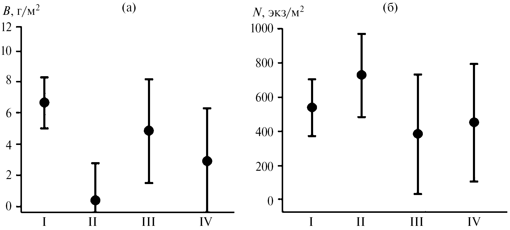 Примечание. S – удельное видовое богатство; N – численность, экз./м2; B – биомасса, г/м2; над чертой – среднее и его ошибка, под чертой – min‒max.