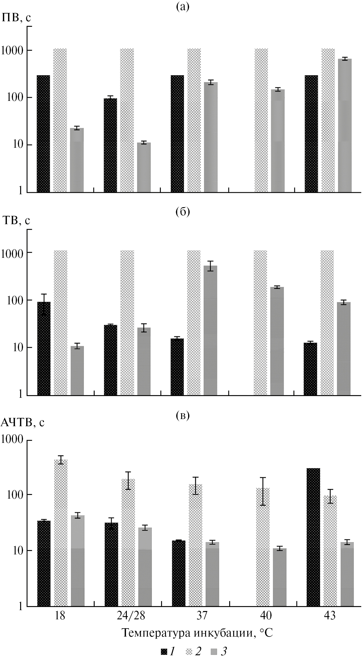 Рис. 1. ПВ (а), ТВ (б) и АЧТВ (в) при различных температурах инкубации плазмы. 1 – Oncorhynchus mykiss, 2 – Clarias gariepinus, 3 – Cyprinus carpio.