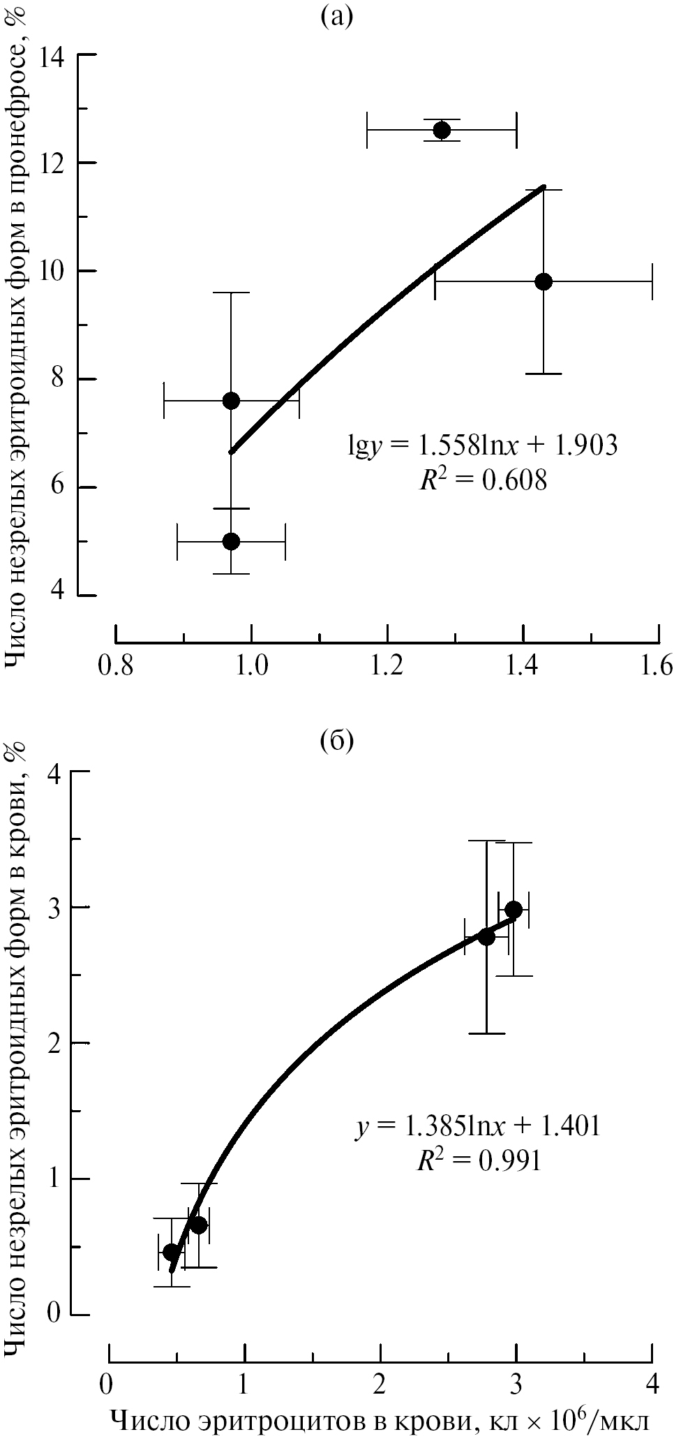 Рис. 4. Корреляционные отношения для систем: а – “незрелых эритроцитов пронефроса – число эритроцитов в крови”, б – “незрелых эритроцитов крови – число эритроцитов в крови”.