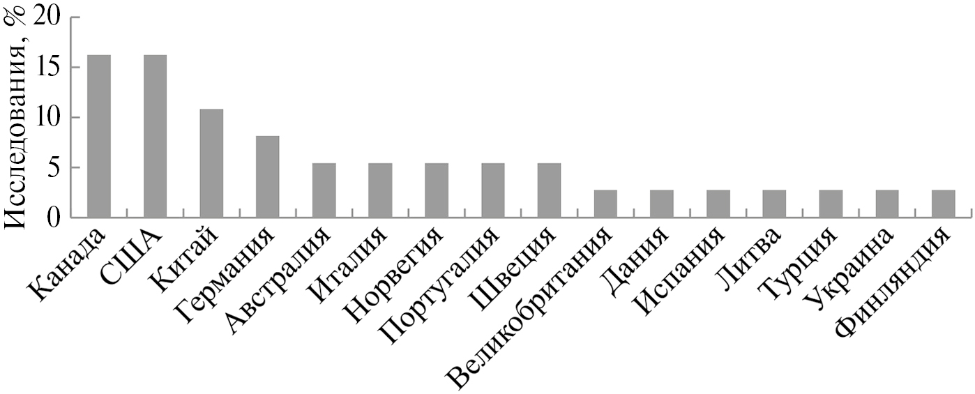 Обобщая сведения о работах разных аспектов поглощения, биоаккумуляции и биологических эффектов МКП у пресноводных двустворчатых моллюсков, можно констатировать, что проведенные к настоящему времени 22 исследования представлены полевыми наблюдениями (43.5), натурными (8.7) и лабораторными (47.8%) экспериментами. В этих работах участвовали представители 16 стран. Бо́льшая часть работ выполнена учеными из США и Канады (рис. 1), чуть меньше – из КНР и Германии. Остальные страны представлены единичными исследователями. В России аналогичных исследований до сих пор не проводили.