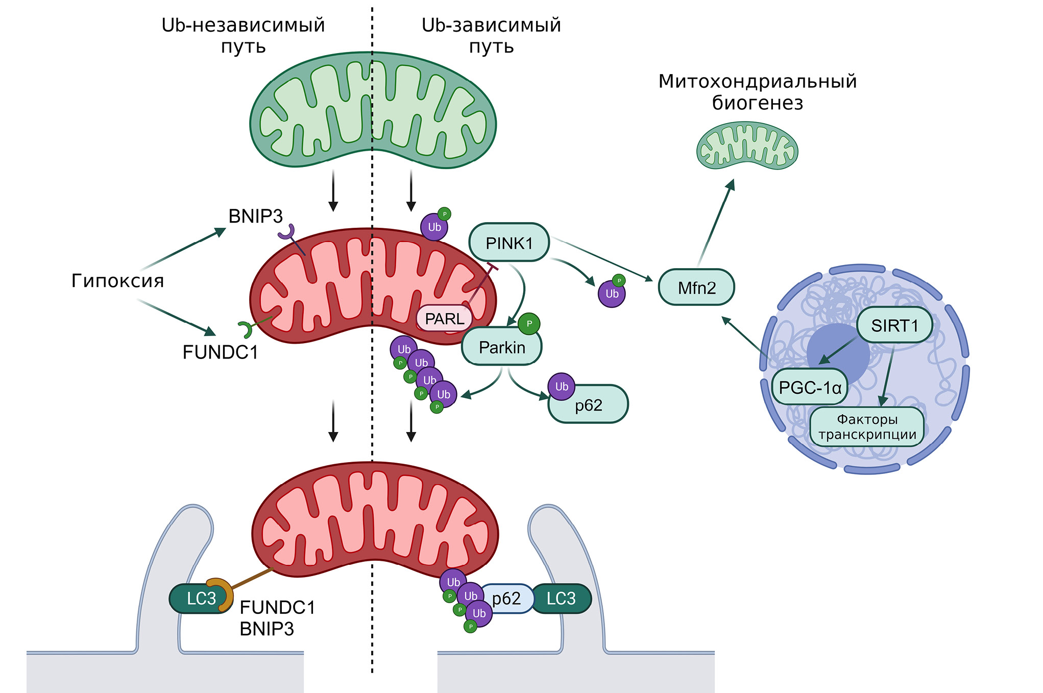 SIRT1, регулируя деацетилирование транскрипционных факторов, может приводить к активации митофагии через путь SIRT1/PGC1α/Mfn2/Parkin [37]. Система PINK1/Parkin катализирует фосфоубиквитинирование Mfn2, запуская p97-зависимую разборку комплексов Mfn2 от внешней митохондриальной мембраны. Это приводит к отделению митохондрий от эндоплазматического ретикулума и их фрагментации, что способствует митофагии [38].