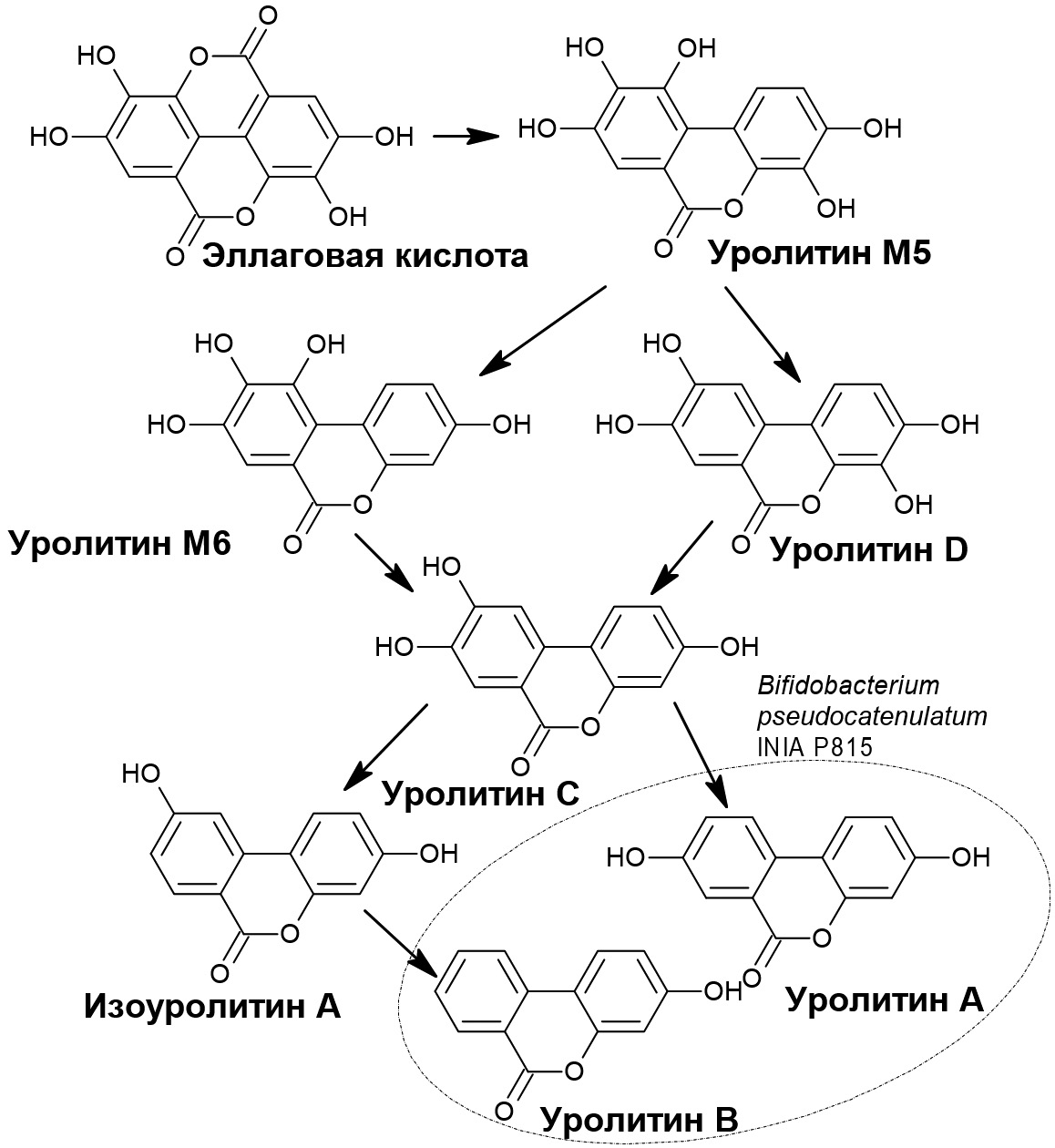 Способность к трансформации эллаготанинов до уролитинов обнаружена у Gordonibacter urolithin- faciens и Gordonibacter pamelaeae (семейство Cori- obacteriaceae), а также у Ellagibacter isourolithinifaciens (семейство Eggerthellaceae) и у штамма Bifidobacterium pseudocatenulatum INIA P815 (рис. 4) [53, 54].