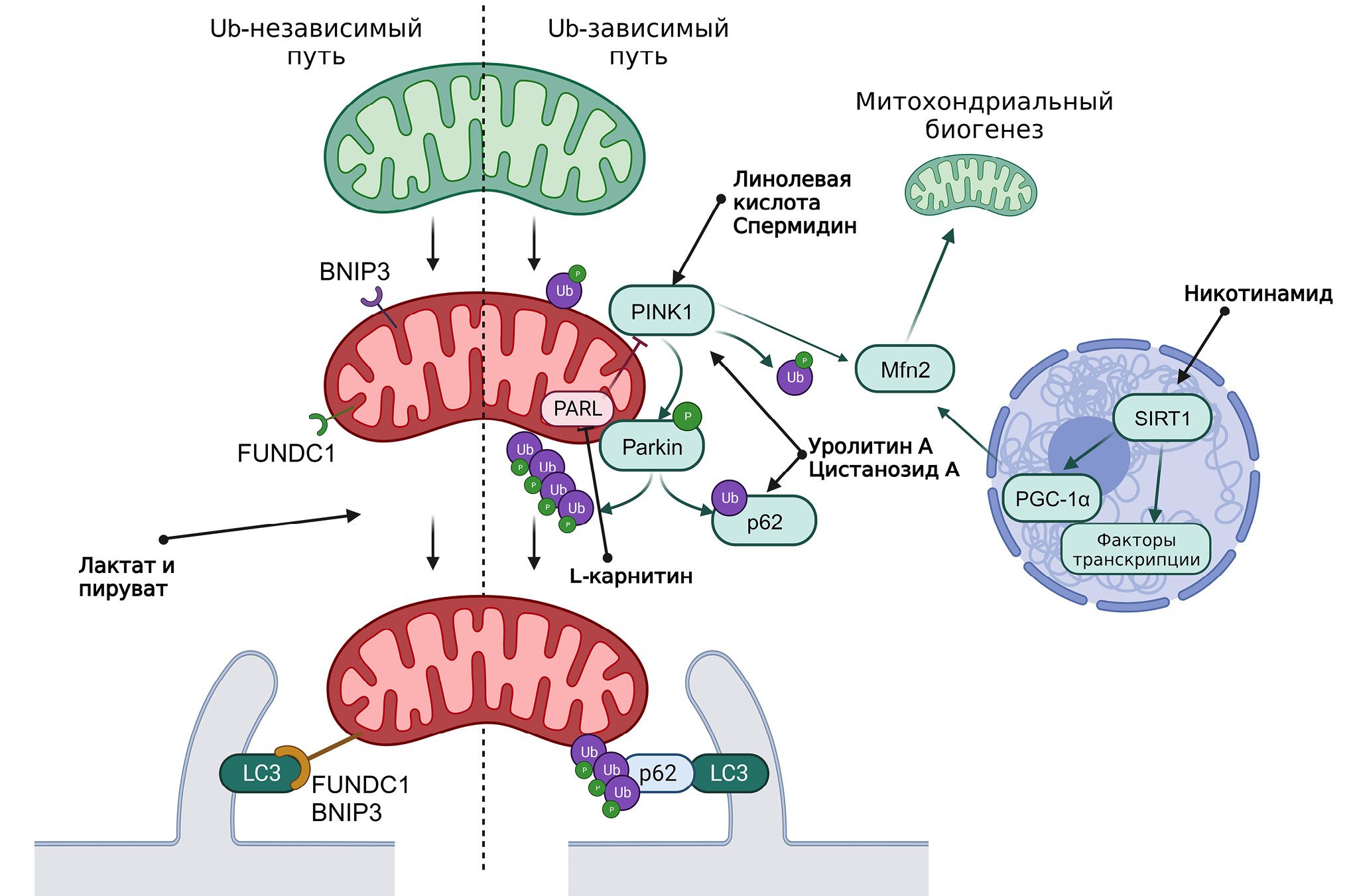 Принятые сокращения: АФК – активные формы кислорода; Akt – RAC-α серин/треонин протеинкиназа; AMPK – АМP-активируемая протеинкиназа; BECN1 – беклин-1; EP300 – гистонацетилтрансфераза p300; FDA – управление по контролю качества пищевых продуктов и лекарственных средств; HIF-1α – индуцируемый гипоксией фактор 1α; LC3 – ассоциированный с микротрубочками белок легкой цепи 3; LKB1 – киназа печени B1; mTOR – мишень рапамицина млекопитающих; mTORC1 – мишень рапамицина млекопитающих комплекс 1; p62/SQSTM1 – секвестосома 1; p70S6K – киназа β1 рибосомального белка S6; PARL – cвязанный с пресенилинами ромбовидный белок; PI3K – фосфатидилинозитол-3-киназа; PINK1 – PTEN-индуцируемая протеинкиназа 1; PGC-1α – пероксисомный пролифератор-активированный рецептор гамма-коактиватора 1-альфа; SIRT1 – сиртуин 1; TFE3 – транскрипционный фактор E3; TFEB – транскрипционный фактор EB; UA – уролитин A; Ub – убиквитин; ULK1 – unc-51-подобная активирующая аутофагию киназа.