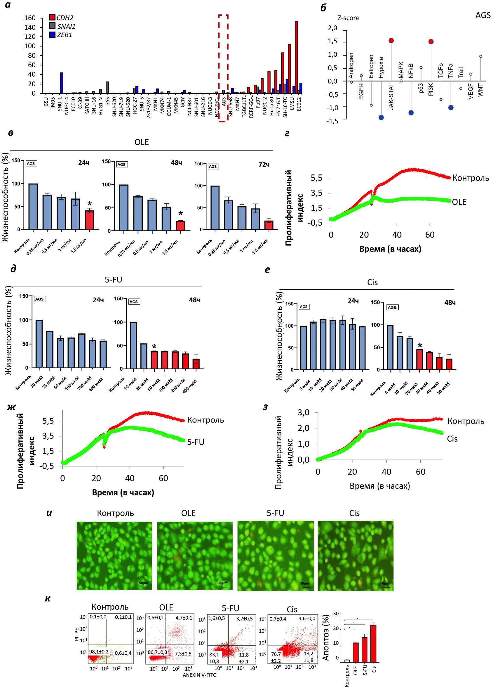Рис. 2. Влияние OLE, 5-FU и Cis на жизнеспособность клеток AGS. а – Экспрессия генов CDH2, SNAI1 и ZEB1 в различных клетках рака желудка (база данных HPA); б – сигнальные пути в опухолевых клетках AGS (база данных HPA); в – жизнеспособность клеток AGS при различных концентрациях OLE (инкубация 24, 48 и 72 ч); г – влияние половинной ингибирующей концентрации (IC50) OLE на пролиферации клеток AGS; д и ж – влияние половинной ингибирующей концентрации (IC50) 5-FU на пролиферацию клеток AGS; е и з – влияние половинной ингибирующей концентрации (IC50) Cis на пролиферацию клеток AGS; и – исследование способности OLE, 5-FU и Cis индуцировать апоптоз клеток AGS методом флуоресцентной микроскопии (окраска красителем AO/PI, содержащим акридиновый оранжевый – АО и йодид пропидия – PI); к – исследование способности OLE, 5-FU и Cis индуцировать апоптоз клеток AGS методом проточной цитометрии. Проводилась окраска опухолевых клеток красителями Annexin V и йодидом пропидия (PI). OLE – экстракт листьев Olea europaea; 5-FU – 5-фторурацил; Cis – цисплатин. Уровень статистической значимости (р) рассчитывался методом однофакторного дисперсионного анализа (ANOVA) и с помощью апостериорного теста Тьюки; * p < 0,05; n = 3