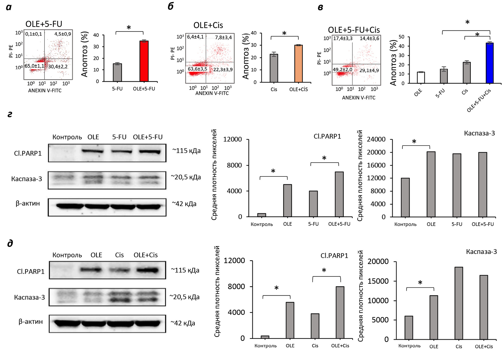 Рис. 4. Исследование способности OLE (1,5 мг/мл), 5-FU (25 мкМ), Cis (20 мкМ) и их комбинаций индуцировать гибель клеток AGS по механизму апоптоза. а–в – Исследование способности комбинаций препаратов OLE + 5-FU, OLE + Cis, OLE + 5-FU + Cis индуцировать апоптоз клеток AGS методом проточной цитометрии. Проводилась окраска опухолевых клеток красителями Annexin V и йодидом пропидия (PI); г и д – исследование способности препаратов OLE, 5-FU, Cis и комбинаций OLE + 5-FU, OLE + Cis индуцировать апоптоз клеток AGS методом вестерн-блоттинга. Маркеры апоптоза – расщепленные формы PARP1 и каспазы-3. β-Актин отражает уровень белка в образцах. На графиках – экспрессия расщепленных форм белков PARP1 и каспазы-3, выраженная в пикселях. OLE – экстракта листьев Olea europaea; 5-фторурацил – 5-FU; цисплатин – Cis. Уровень статистической значимости (р) рассчитывался методом однофакторного дисперсионного анализа (ANOVA) и с помощью апостериорного теста Тьюки; * p < 0,05; n = 3