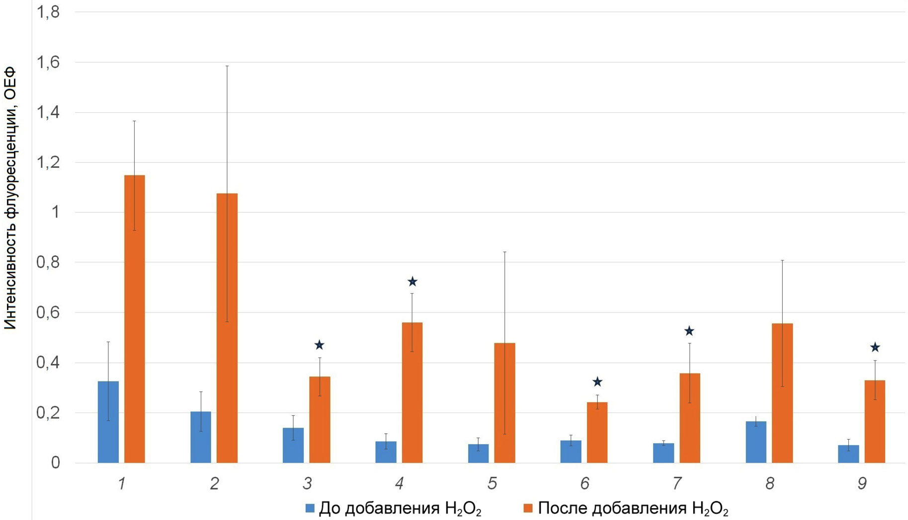 Рис. 4. Уровень флуоресценции (538 нм) внутриклеточного сенсора HyPer в присутствии пептидов, измеренный перед добавлением и после добавления пероксида водорода. 1 – Положительный контроль, 2 – AB-10, 3 – AB-11, 4 – AB-12, 5 – AB-13, 6 – AB-14, 7 – AB-15, 8 – AST-1, 9 – ST-10. Звёздочками помечены пептиды, интенсивность флуоресценции которых после внесения пероксида водорода статистически значимо (p < 0,05) отличалась от положительного контроля