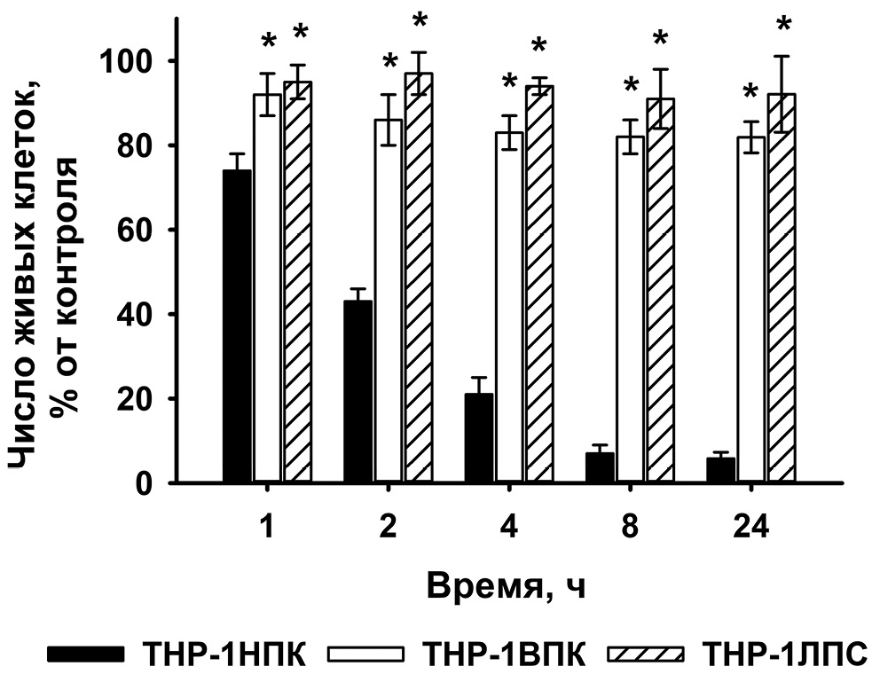 Рис. 1. Жизнеспособность клеток ТНР-1НПК, ТНР-1ВПК и ТНР-1ЛПС после инкубации со 100 нг/мл izTRAIL в течение 1, 2, 4, 8 и 24 ч. Данные приведены в виде среднего значения ± SD (n ≥ 5). * р < 0,05 в сравнении c клетками THP-1 НПК