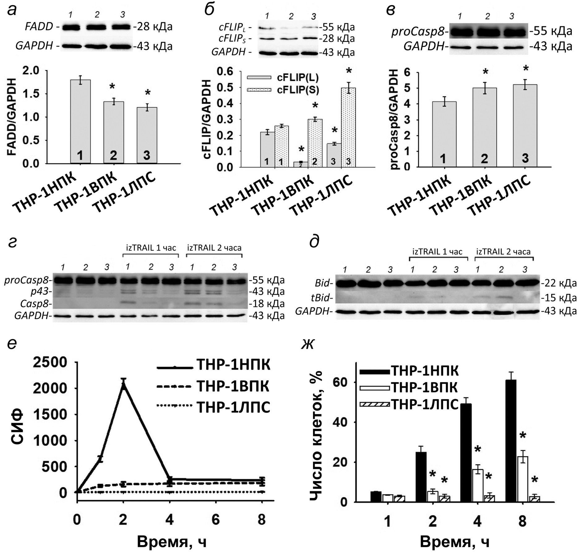 Рис. 3. Анализ активации внутриклеточного TRAIL-зависимого проапоптотического сигнального пути в TRAIL-резистентных клетках THP-1ВПК и THP-1ЛПС. Содержание белков FADD (а), cFLIP (б) и прокаспазы 8 (в) в клетках THP-1ВПК (1 столбец), THP-1НПК (2 столбец) и THP-1ЛПС (3 столбец) относительно референсного белка GAPDH. Содержание белков каспазы 8 (г) и tBid (д) в клетках THP-1ВПК (1 столбец), THP-1НПК (2 столбец) и THP-1ЛПС (3 столбец) до и после 1 и 2 ч обработки 100 нМ izTRAIL относительно референсного белка GAPDH. Cредняя интенсивность флуоресценции (СИФ) AMC (е) и число клеток, содержащих cleaved PARP1/2 (Asp214) (ж), в популяции ТНР-1НПК, THP-1ВПК и ТНР-1ЛПС до и после 1, 2, 4 и 8 ч обработки 100 нг/мл izTRAIL относительно референсного белка GAPDH. Данные приведены в виде среднего значения ± SD (n ≥ 5). * р < 0,05 в сравнении c клетками THP-1 в НПК