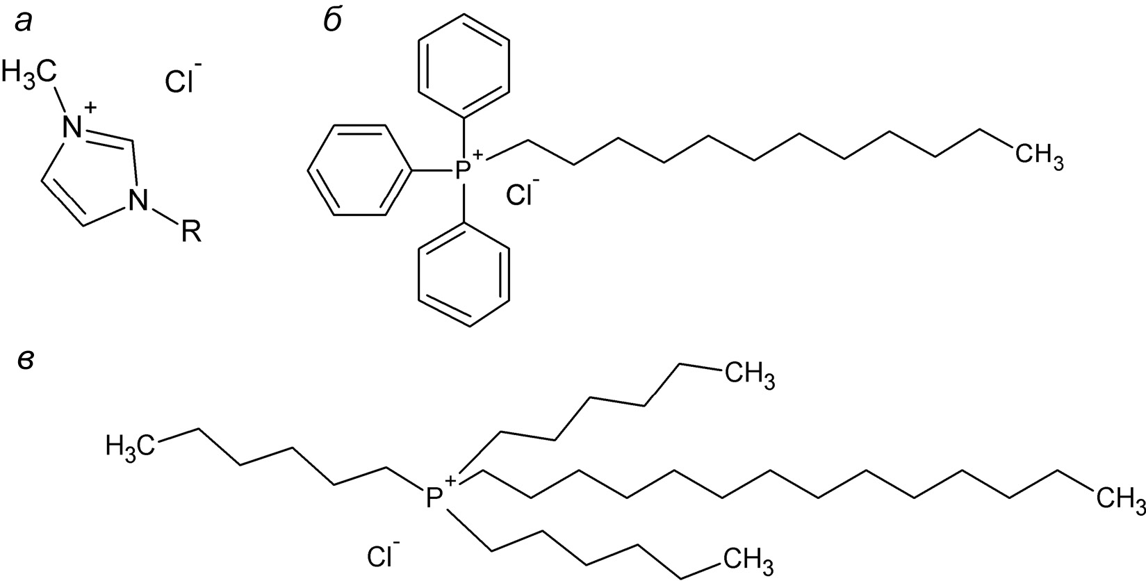 Рис. 1. Структурные формулы наиболее токсичных имидазолиевых ИЖ: С12Mim-Cl (а); C14Mim-Cl (б) и C16Mim-Cl (в)