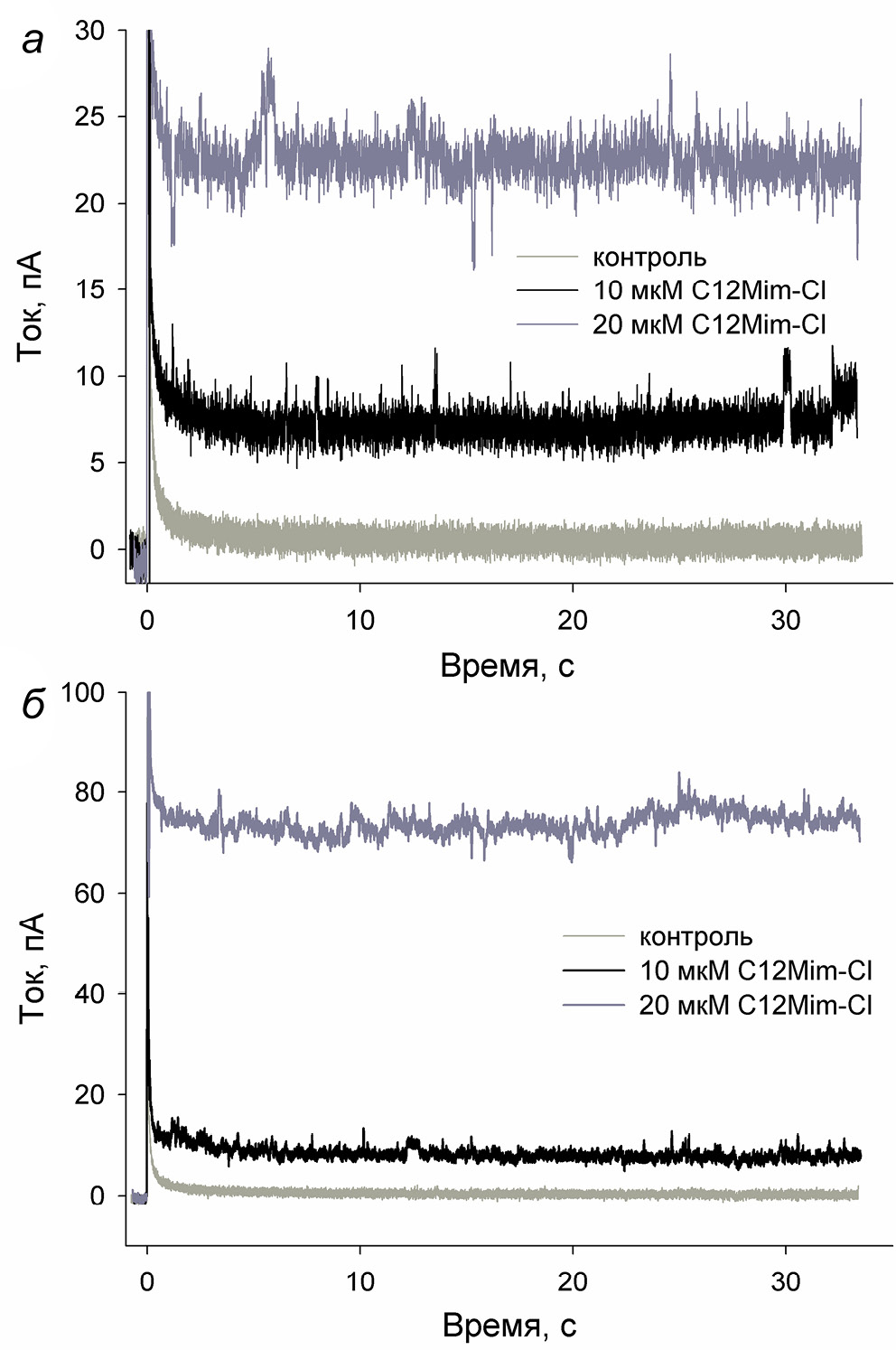 Эксперименты на модельных мембранах. Мы сосредоточились на проверке двух гипотез о механизме влияния ИЖ на клеточный метаболизм. Согласно первому предположению, мишень токсичности ИЖ находится внутри клетки. Согласно второму предположению, ИЖ влияют на ПМ клеток. Мы проверили, могут ли имидазолиевые ИЖ проникать через липидный бислой, не повреждая его. Таким свойством обладают проникающие липофильные ионы [25–27]. Для облегчения проникновения катионных имидазолиевых ИЖ мы формировали плоскую бислойную липидную мембрану (БЛМ) из дифитанил-ФХ, липида, содержащего простые эфирные связи [28]. После добавления 10 или 20 мкМ С12Mim-Cl ток через мембрану при прикладывании напряжения 50 мВ в момент времени t = 0 с увеличивался по сравнению с немодифицированной БЛМ (рис. 2, а). Записи имели вид нерегулярных флуктуаций тока.