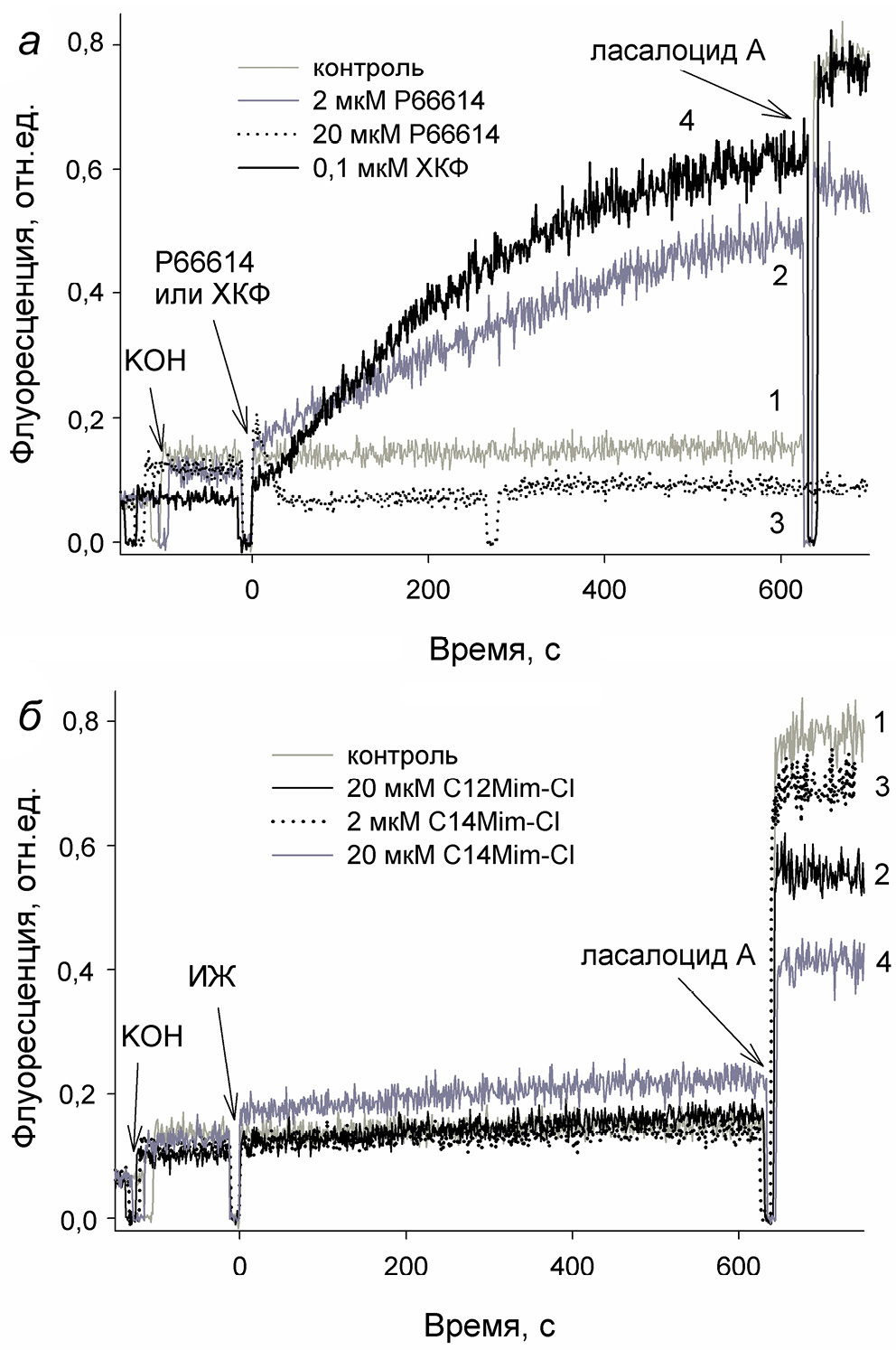 Некоторые липофильные катионы в комплексе с жирной кислотой обладают протонофорным эффектом: они проходят через мембрану в одном направлении как индивидуальные катионы, а в обратном – в паре со свободной жирной кислотой, т.е. в электронейтральной форме. Протонофорный цикл завершает переход протонированной жирной кислоты через мембрану и диссоциация протона [31, 32]. Липосомы, содержащие pH-чувствительный краситель пиранин, служат удобным инструментом для детекции протонофорной активности различных веществ. На рис. 3, а продемонстрирована кинетика выравнивания pH снаружи и внутри пиранин-содержащих липосом, вызванная добавкой протонофора карбонилцианид-m-хлорофенилгидразона (ХКФ) или ионной жидкости Р66614. Ранее было показано, что при низких концентрациях Р66614 проходит через липидный бислой, не повреждая его, а при высоких концентрациях – увеличивает неспецифическую проводимость мембраны [30]. Важно отметить, что добавка неэлектрогенного К+/Н+-обменника ласалоцида А в конце эксперимента приводила к примерно одинаковому увеличению флуоресценции пиранина в опытной пробе (содержащей 2 мкМ P66614) и в контрольной. Это означает, что пиранин под влиянием Р66614 в течение эксперимента не выходил из липосом наружу. Иными словами, протонофорный эффект Р66614 не являлся следствием повреждения мембран липосом. Таким образом, добавка Р66614 к липосомам через несколько минут вызывала выравнивание протонного градиента. Однако при увеличении концентрации Р66614 до 20 мкМ происходило быстрое уменьшение флуоресценции, которое не изменялось при дальнейшем добавлении ласалоцида А. Очевидно, что при высокой концентрации Р66614 происходил полный выход пиранина и его флуоресценция тушилась ксилен-пиридиниум бромидом во внешнем буфере.