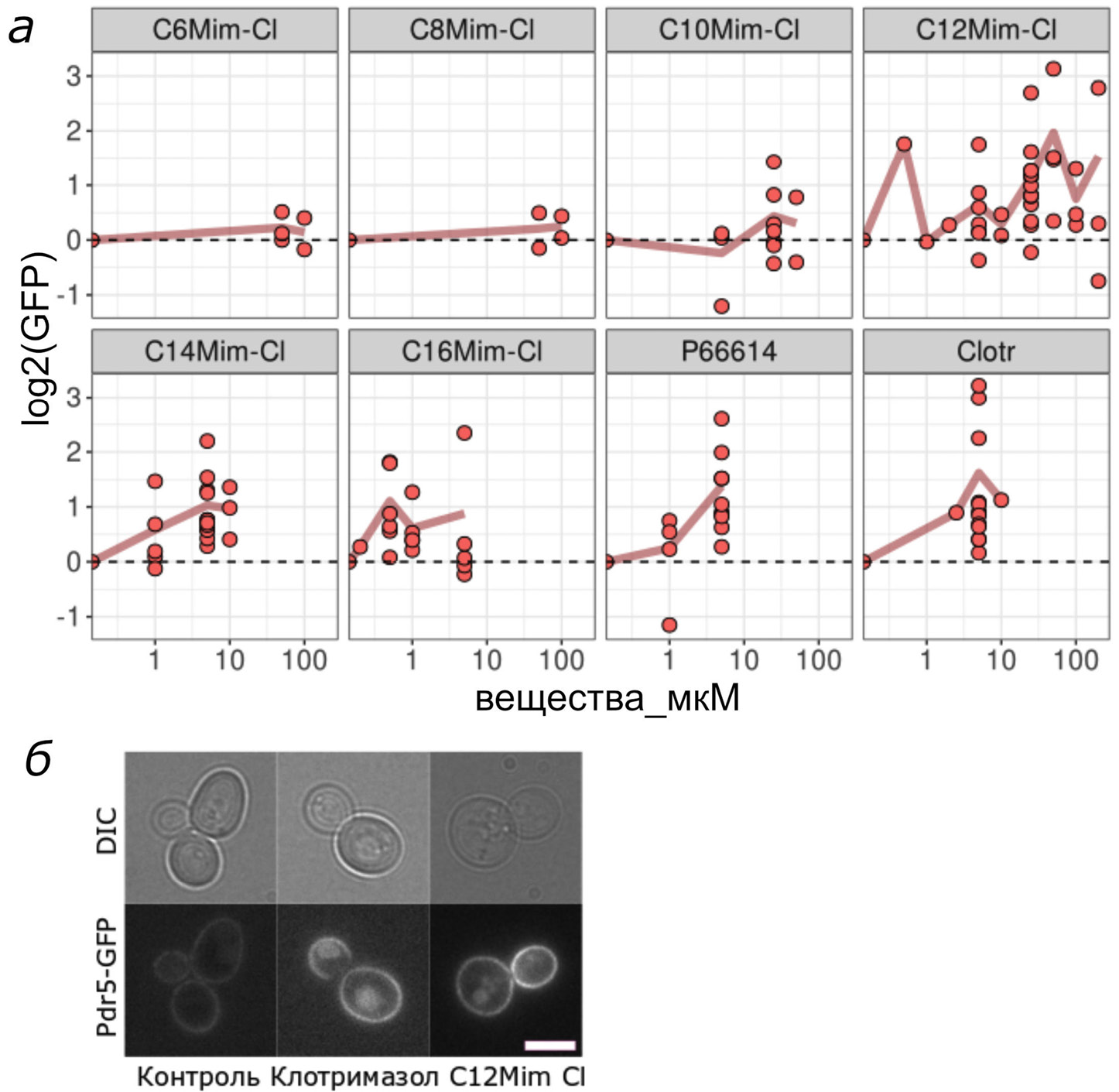 Рис. 4. ИЖ увеличивают содержания Pdr5–GFP. а – Сравнение увеличения количества Pdr5–GFP через 1 ч после добавления ИЖ и стандартного индуктора Pdr5–GFP клотримазола с помощью проточной цитометрии. По оси X отложена логарифмическая шкала концентрация веществ в мкМ; по оси Y – логарифмическая шкала флуоресценции Pdr5–GFP в клетках относительно клеток без добавления веществ (значение 0). Каждая точка – независимый биологический повтор. б – Световая и флуоресцентная микроскопия клеток, содержащих Pdr5–GFP, через 1 ч после добавления С12Mim-Cl и стандартного индуктора Pdr5–GFP клотримазола. Размерный отрезок – 5 мкм