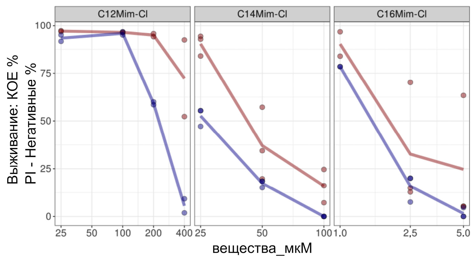 Рис. 6. Сравнение выживаемости клеток S. cerevisiae после воздействия имидазолиевых ИЖ, С12Mim-Cl, С14Mim-Cl и С16Mim-Cl, по числу КОЕ (синие кривые) и доле PI-негативных клеток (красные кривые). По оси Х отложена концентрация ИЖ в мкМ; по оси Y – выживание относительно контроля без добавления веществ, в процентах