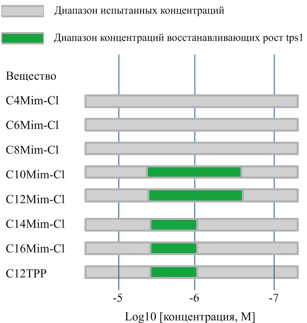 В данной работе мы показали, что ИЖ с logP ≥ 0,99 способны восстанавливать рост штамма дельта tps1 на среде в присутствии глюкозы (рис. 7) (детали получения и обработки данных показаны на рис. П1 в Приложении). Важно отметить, что диапазон концентраций, в которых вещества С10Mim-Cl и С12Mim-Cl стимулируют рост клеток tps1, шире, чем у хорошо изученного проникающего катиона, митохондриального разобщителя С12ТРР [31]. Возможно, вызванное ИЖ нарушение укладки фосфолипидов стимулирует гидролиз ATP: очевидно, репарация мембраны и/или восстановление внутриклеточного гомеостаза, нарушенного при повреждении ПМ, являются энергоемкими процессами. Мы предполагаем, что такая стимуляция гидролиза ATP является причиной способности ИЖ стимулировать рост клеток дельта tps1 в присутствии глюкозы. Таким образом, вызванное ИЖ небольшое нарушение плазматической мембраны в некоторых случаях может быть полезным для клетки.