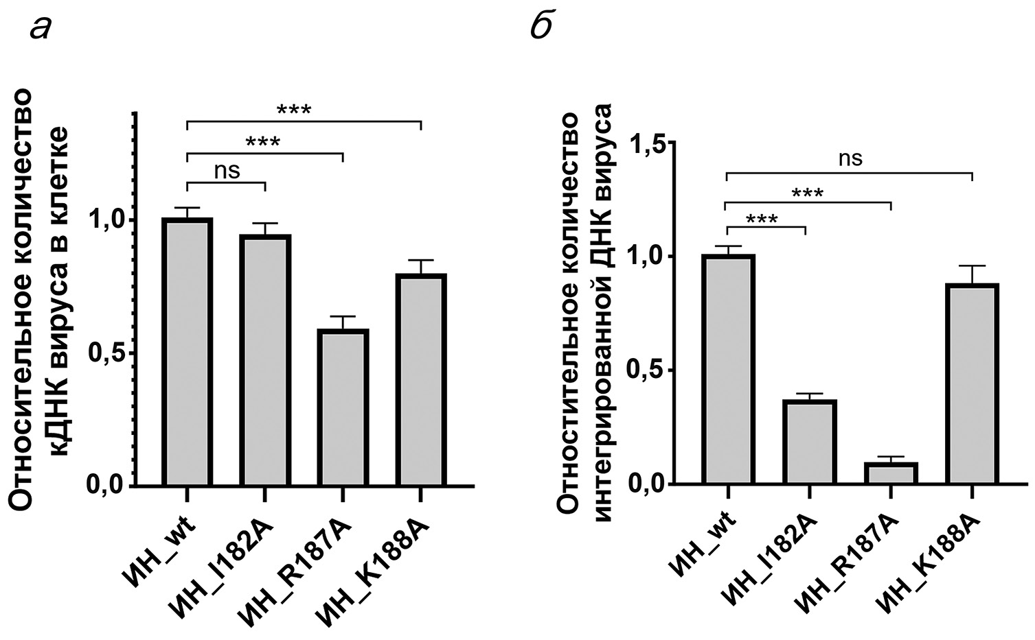 Рис. 2. Относительное количество общей вирусной кДНК (а) и интегрированной вирусной кДНК (б) после трансдукции клеток HEK 293T псевдовирусами с ИН_wt и мутантными белками. Представлены средние значения трех независимых экспериментов. Значимость определялась двусторонним дисперсионным анализом с поправкой Шидака на множественные сравнения; *** p < 0,001; ns – не значимо