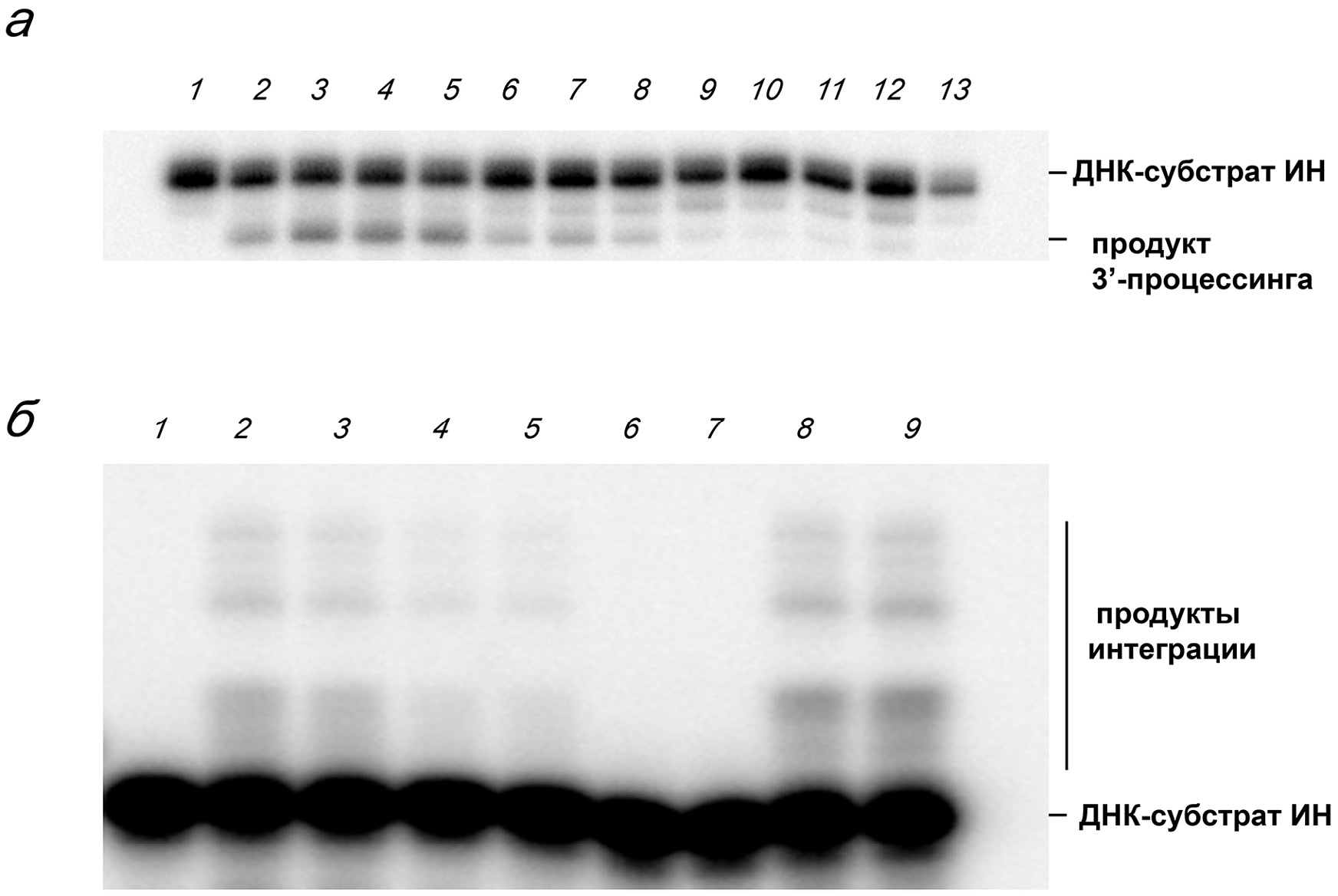 Рис. 3. Электрофоретический анализ каталитической активности ИН_wt и мутантов ИН_I182A, ИН_R187A, ИН_K188A в реакциях 3′-процессинга (а) и переноса цепи (б). а – Дуплекс U5B/U5A без ИН (дорожка 1); в присутствии ИН_wt (дорожки 2, 3); в присутствии ИН_K188A (дорожки 4, 5); в присутствии ИН_I182A (дорожки 6–9); в присутствии ИН_R187А (дорожки 10–13). Реакцию проводили с 5 нМ ДНК-дуплексом и увеличивающимися концентрациями ИН: 100 нМ (дорожки 2, 4, 6, 10); 200 нМ (дорожки 3, 5, 7, 11); 400 нМ (дорожки 8, 12) и 800 нМ (дорожки 9, 13). б – Дуплекс U5B-2/U5A без ИН (дорожка 1); в присутствии ИН_wt (дорожки 2, 3); в присутствии ИН_K182A (дорожки 4, 5); в присутствии ИН_I187A (дорожки 6, 7); присутствии ИН_R188А (дорожки 8, 9). Реакцию проводили с 10 нМ ДНК-дуплексом и концентрациями ИН: 100 нМ (дорожки 2, 4, 6, 8) и 200 нМ (дорожки 3, 5, 7, 9)
