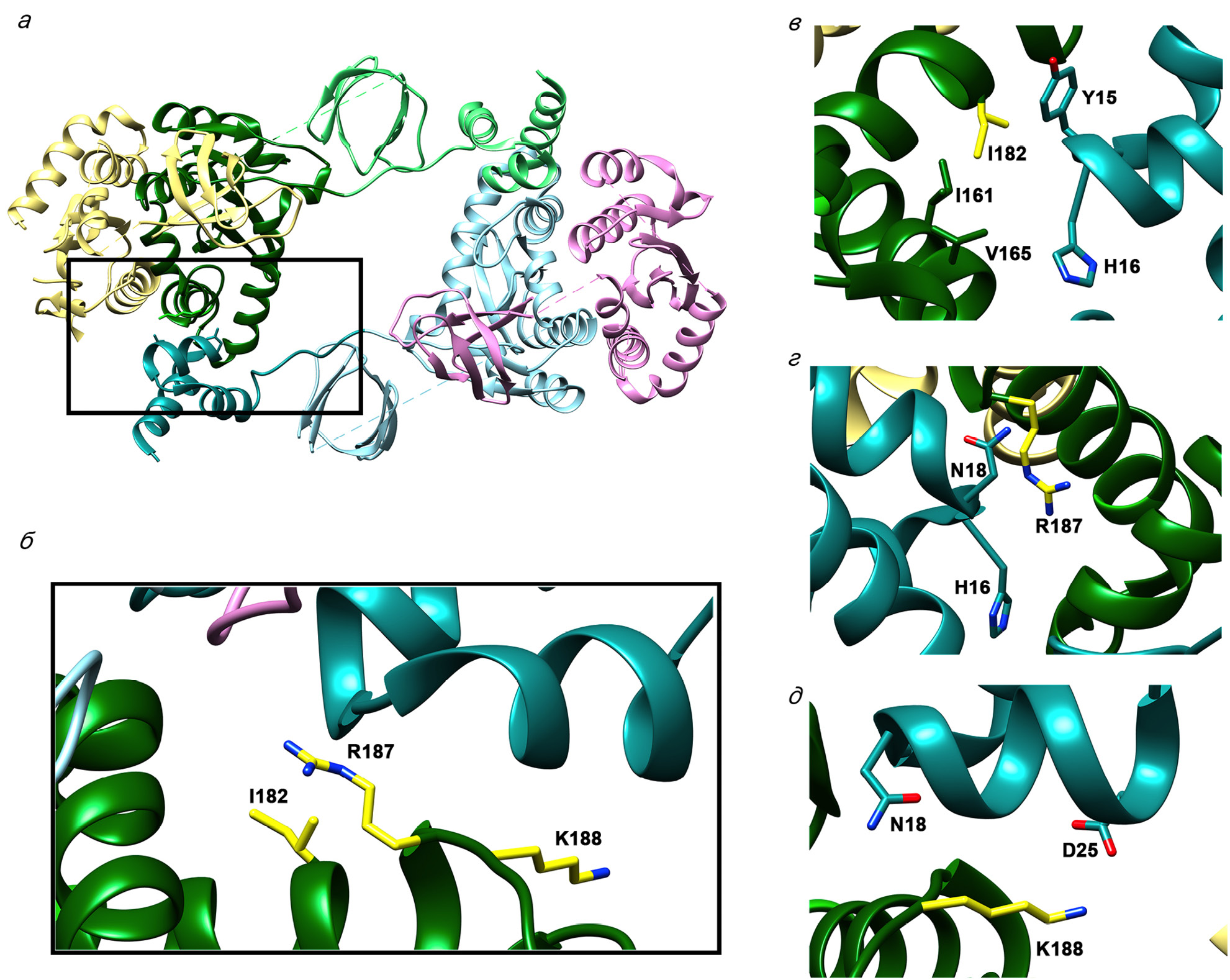 Рис. 7. Расположение аминокислот I182, R187 и K188 в структуре ИН (по данным Passos et al. [13] (PDB 5U1C)). а – Структура тетрамера ИН ВИЧ-1. Разными цветами отмечены отдельные субъединицы ИН. б – Прямоугольником выделено и увеличено место расположения аминокислот I182, R187 и K188 (выделены ярко-желтым) каталитического домена одной субъединицы (выделен зеленым) и N-концевого домена другой субъединицы (выделен бирюзовым). в–д – Окружение аминокислот I182, R187 и K188 соответственно