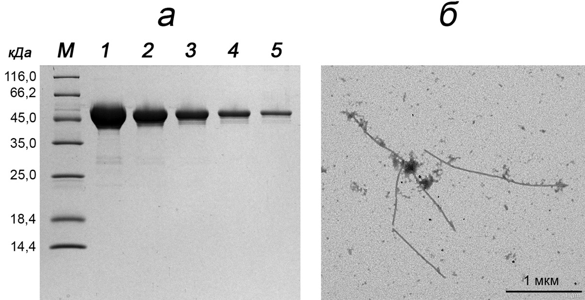 Рис. 1. Анализ препарата рекомбинантного флагеллина RecFlic-FM. а – Электрофоретический анализ в 13%-ном ДСН-ПААГ, окрашивание в Кумасси G-250; дорожки: М – маркеры молекулярной массы белков, кДа («Thermo Fisher Scientific», США), 1–5 – RecFlic-FM в концентрации 1, 0,5, 0,25, 0,1 и 0,05 мг/мл соответственно. б – Просвечивающая электронная микроскопия, контрастирование 2%-ным водным раствором уранилацетата; размер метки – 1 мкм